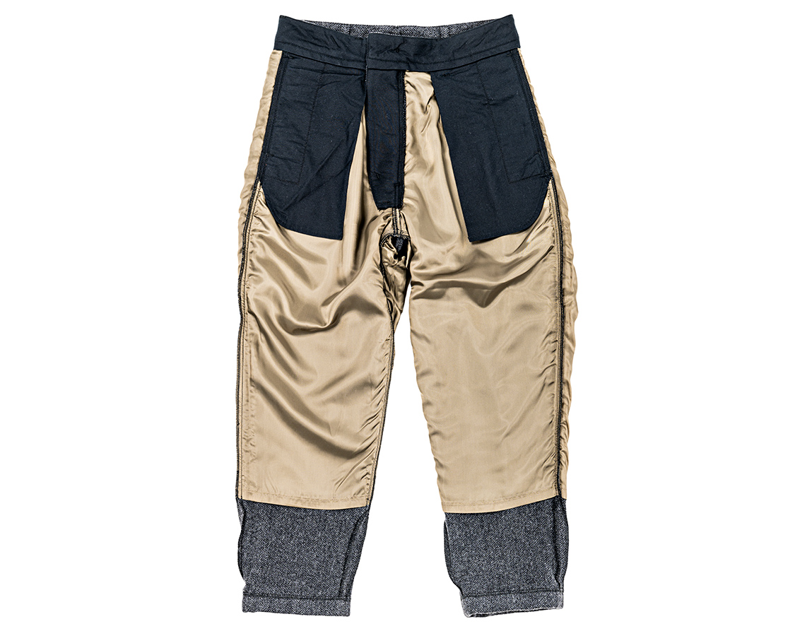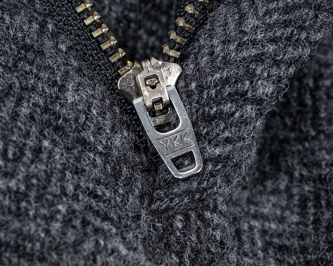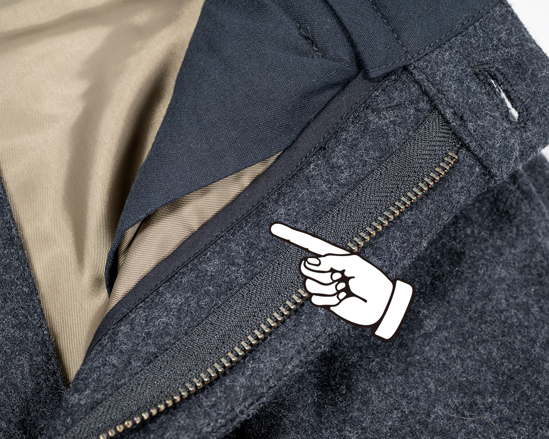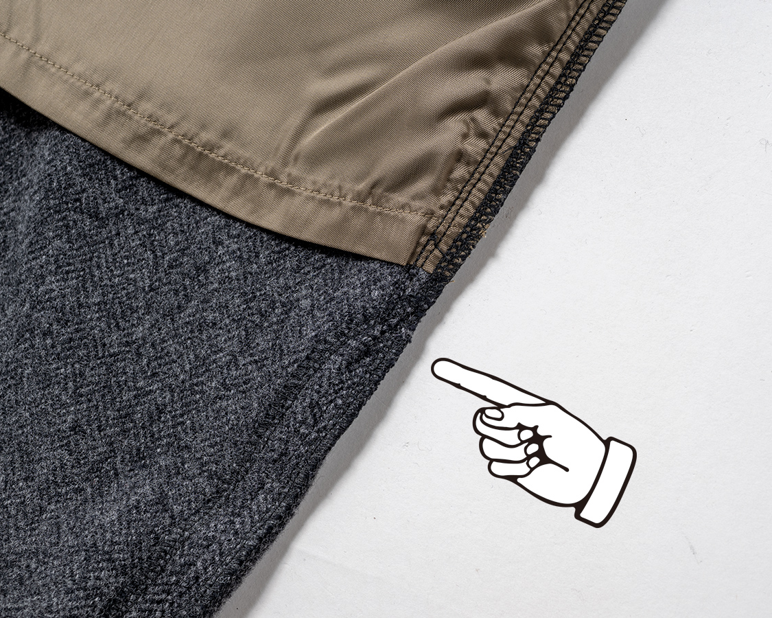 縫ってくれる工場のFさんから教えてもらった。途中で縫い代を割る方法。矢印から上は合いロックで倒し。たから、表地のウールは体に当たらない。