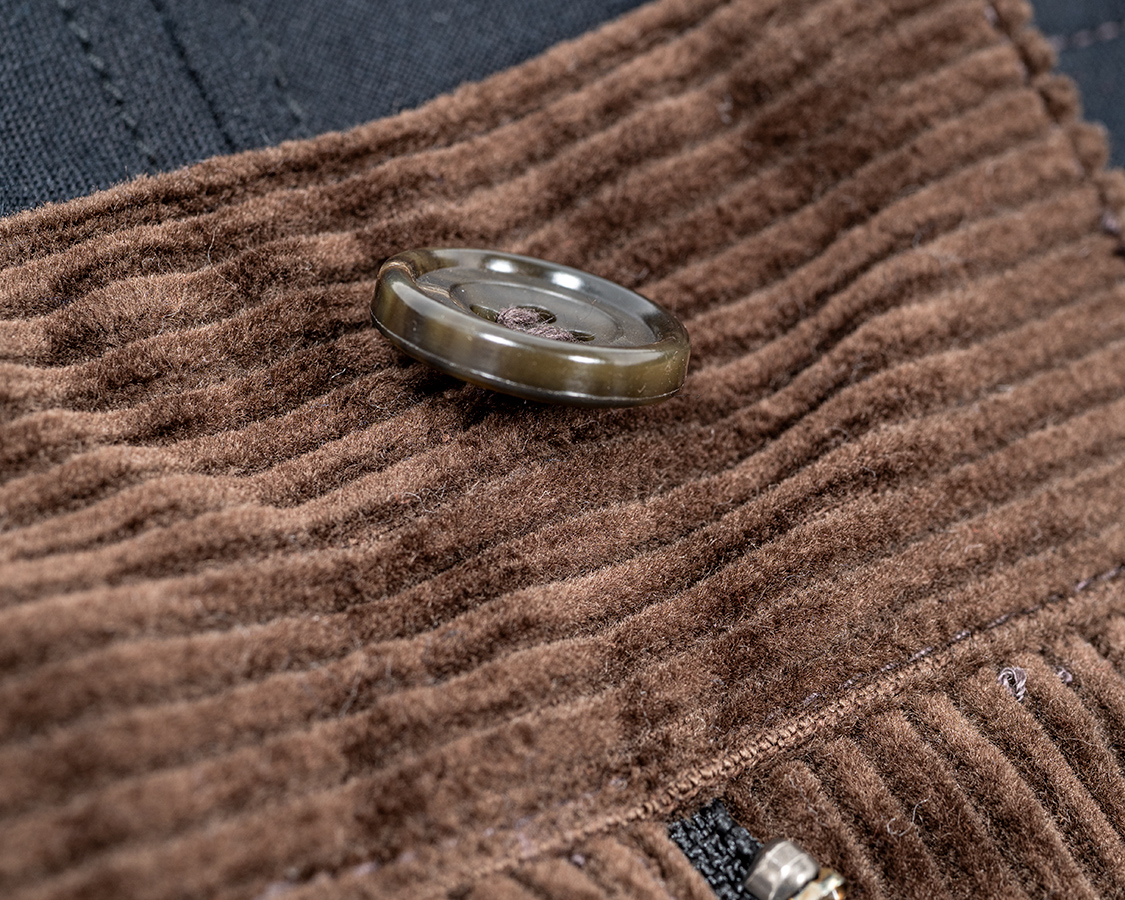 ボタンは足をつけて、厚みのある生地が収まるようにしています。