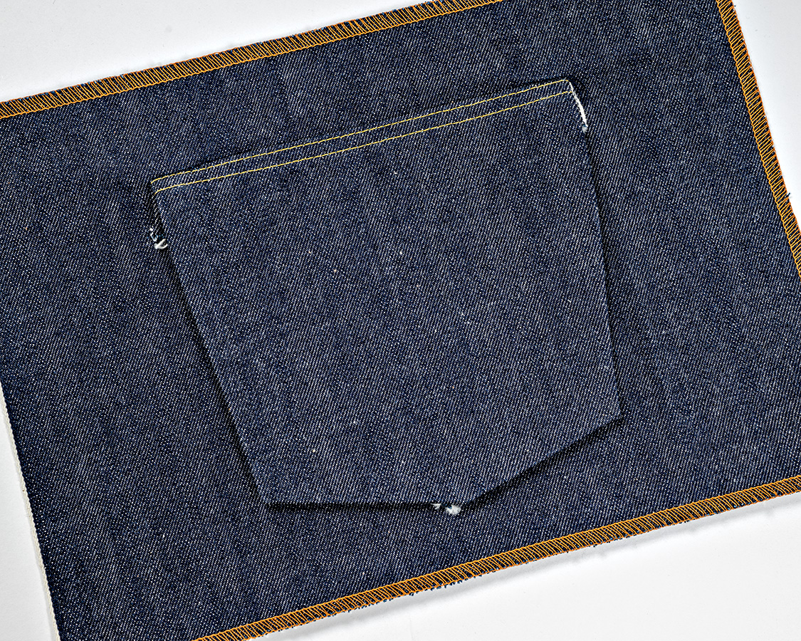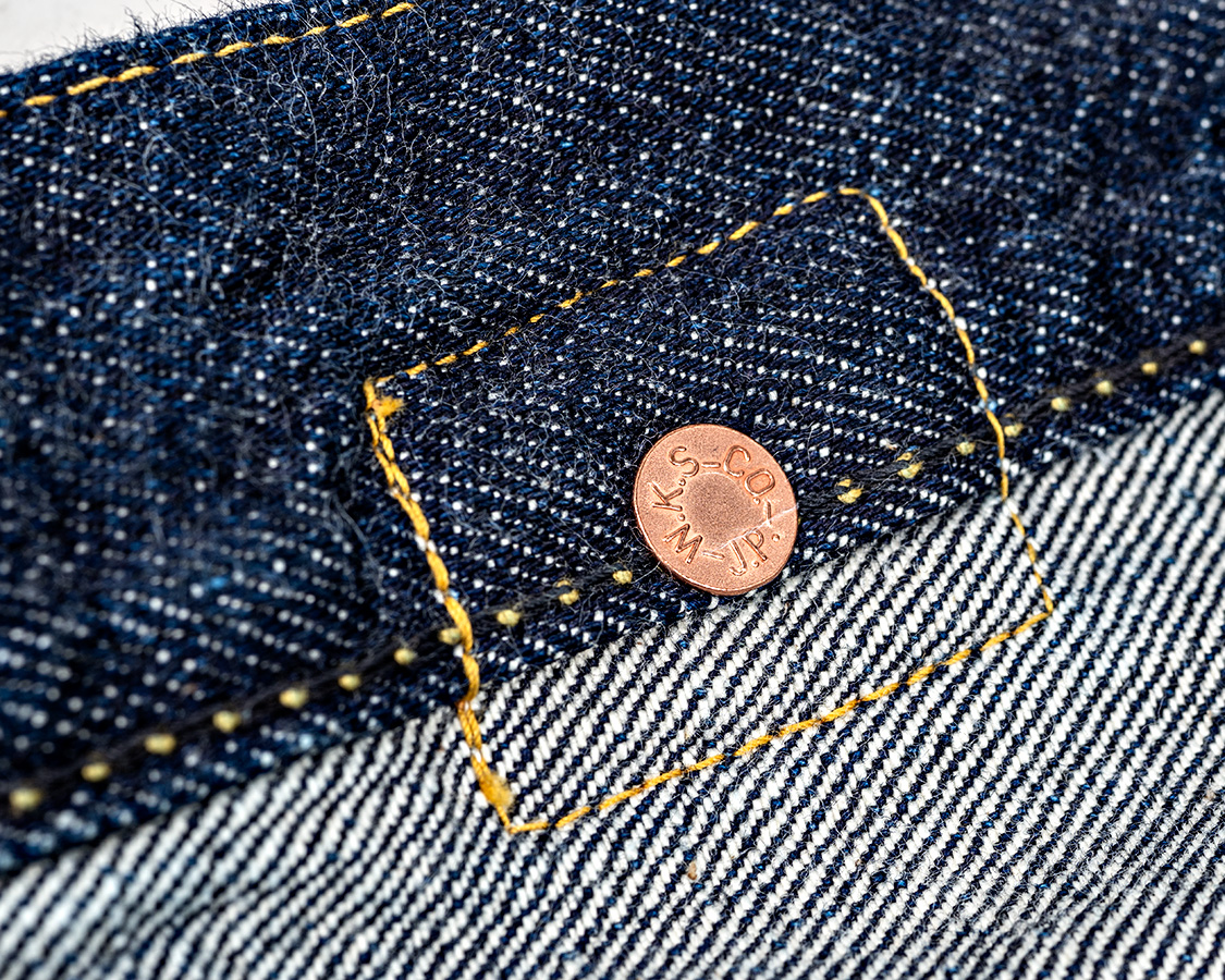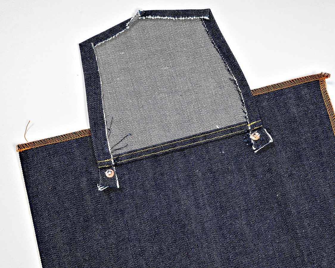 これが隠しリベットの縫い方。一部に切込みを入れてリベット+隠しカンヌキでポケットを止める。それから、ステッチを打つ・・・というやり方。