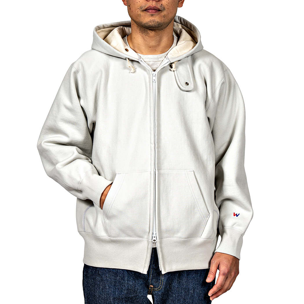 本家は化繊入り・カサッとしたスウェット生地に対し、WORKERS は表30番・中30番・裏7番の綿100。裏の糸ループを短く編み、 さらに起毛をかけた本格的冬用スウェットです。
