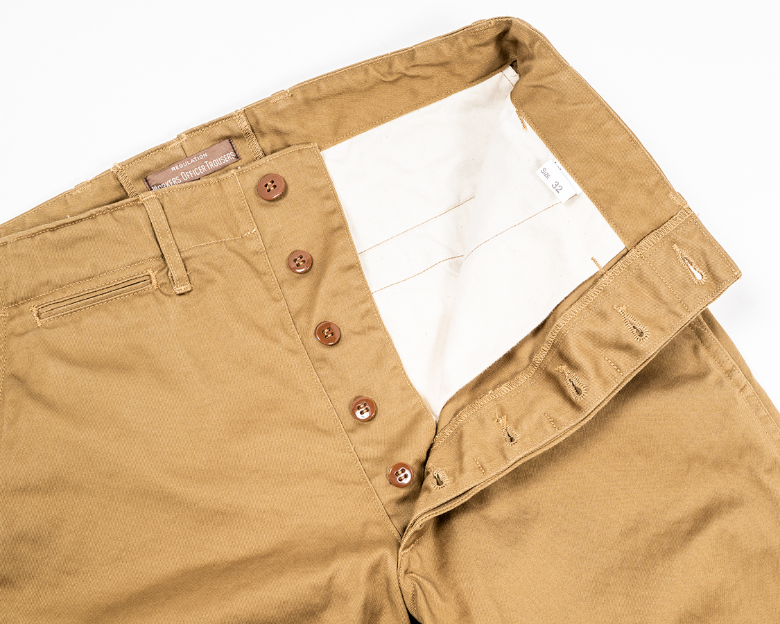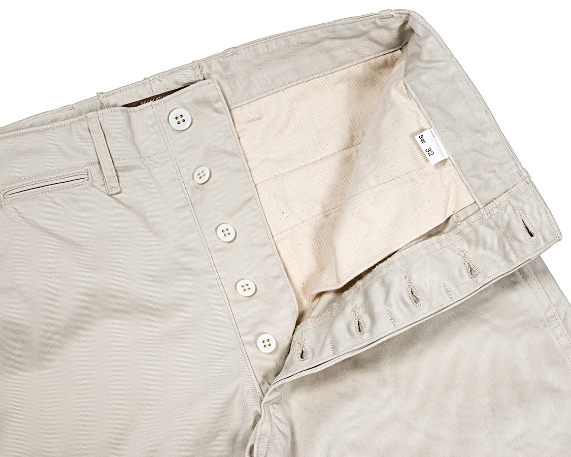 フロントボタンフライ、比翼止めステッチ有り。クラシックなトラウザーズの仕様。