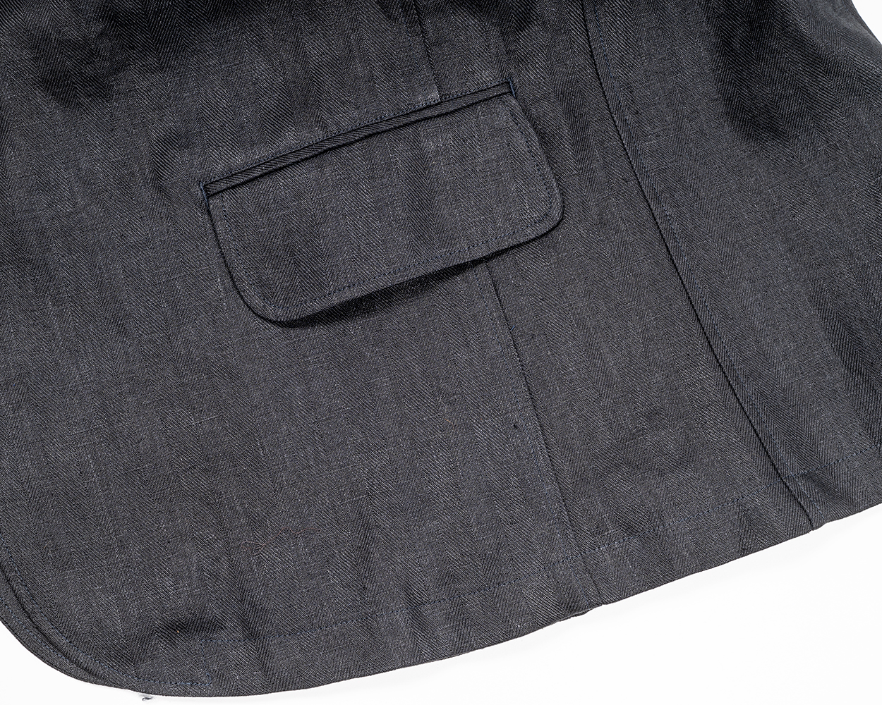 脇についたフラップポケット。片玉縁に流し込み+端は閂止め。