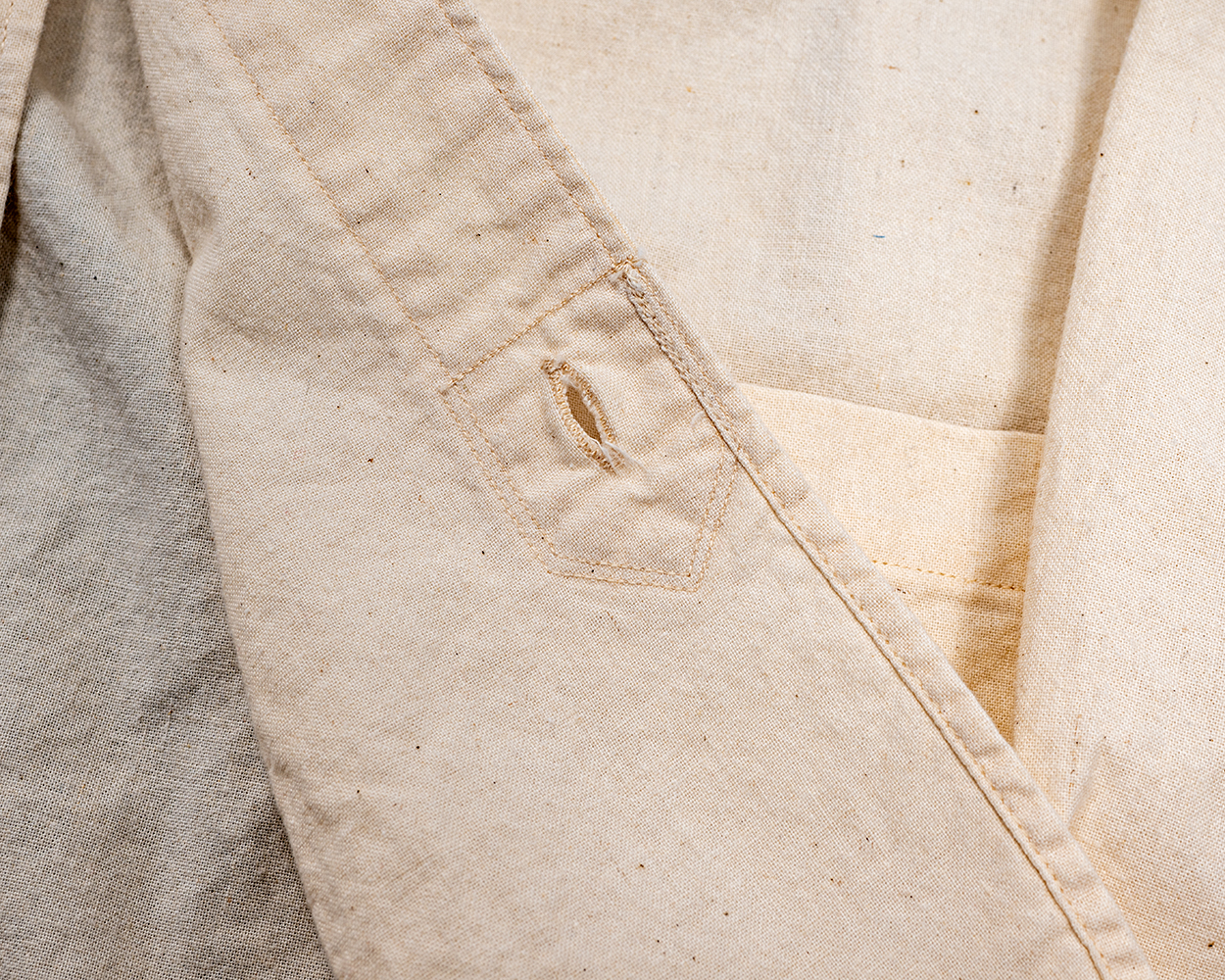 下前側は別布を流し込みながら一緒に三巻始末。さらに、ボタンを付けることで、別布がすっぽ抜けないように。