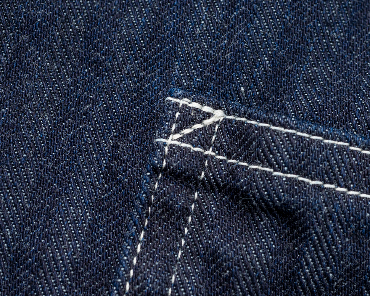 角の補強。ここはカンヌキを使わずステッチで止める。かなり古いカバーオールがモデルなので、おそらく工場にカンヌキミシンがなかったのでしょう。参考にしたオリジナルがこのような補強だったので再現しています。現代的には、カンヌキミシンを使ってもらった方が楽なのですが。