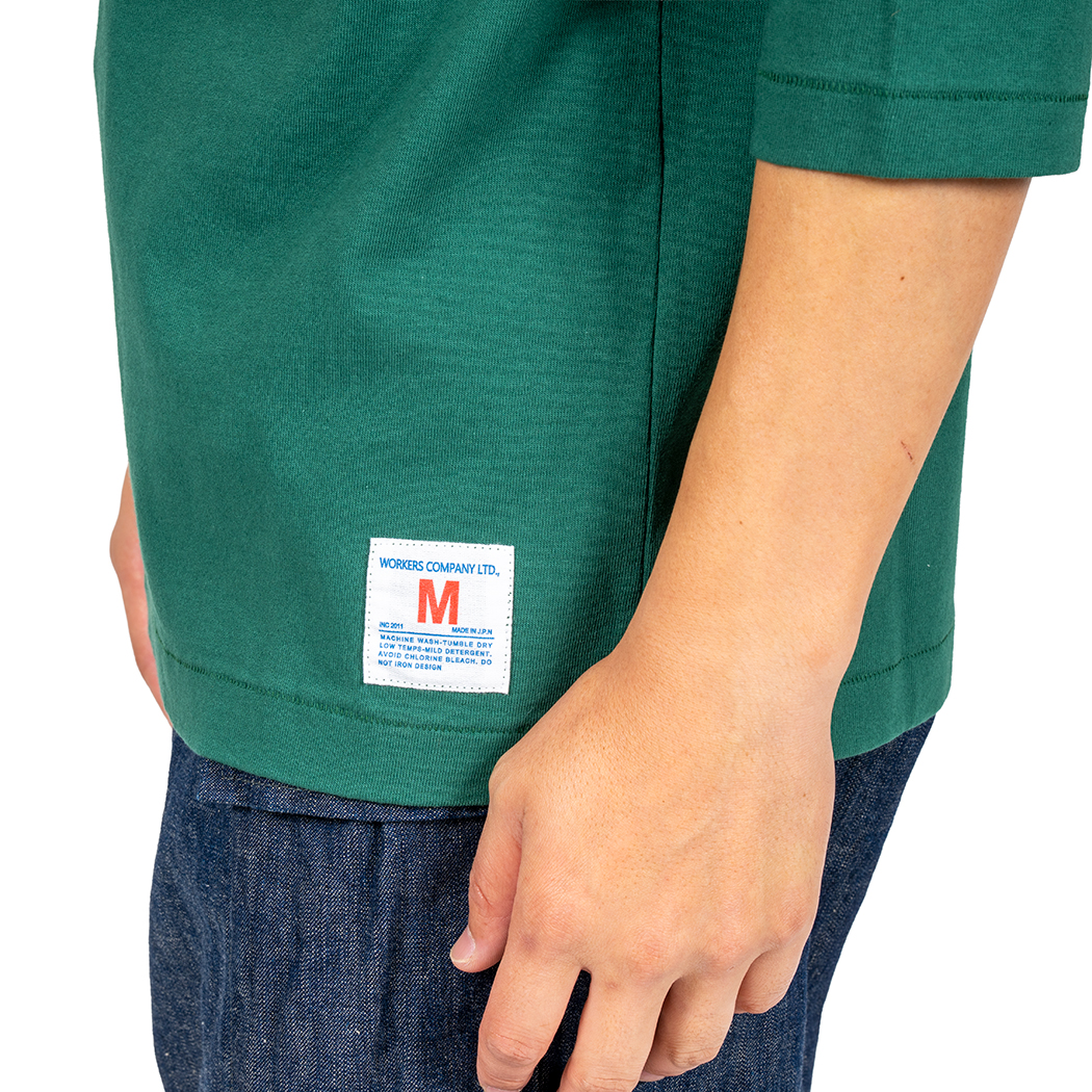 素材は16 番単糸の天竺。単糸、そう2PLY やボーダーが「双糸」に対し、糸1 本で編む「単糸」。糸の 撚り方向に生地自体が斜行(しゃこう)しています。もちろん、「セット」という工程である程度はまっすぐにしますが、 それでも完全には斜行が取れない。その若干ねじれた感じがビンテージのあのT シャツの感じでもあります。