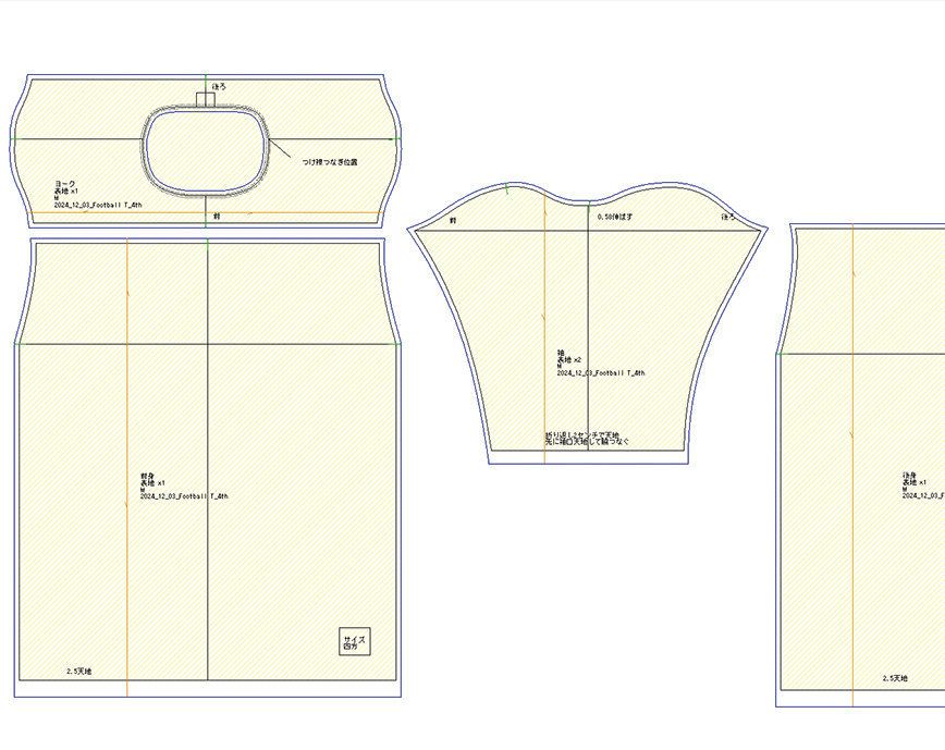 最初に悩んだのが、肩先の変な出っ張り。その分、袖の山がへこんでいる。これがフットボールT のデザインなので再 現しないわけにはいかない。