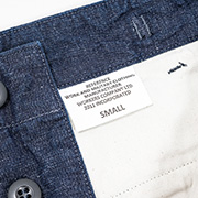 FWP Trousersの着想の元、「ファティーグトラウザーズ」で使われる、6オンス程度のコットンポプリンがモチーフ。平織りなので、ライトチノより固い手触り。 |