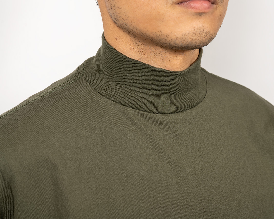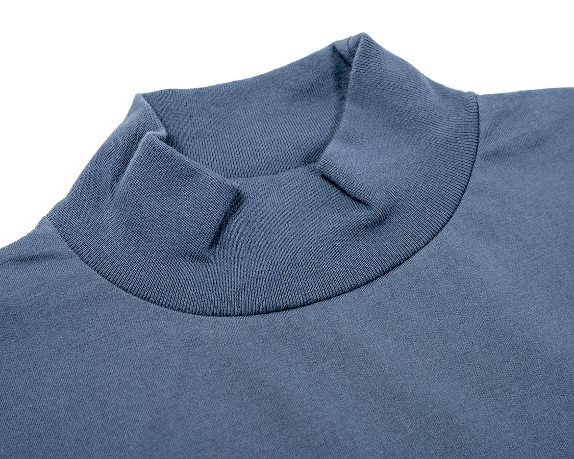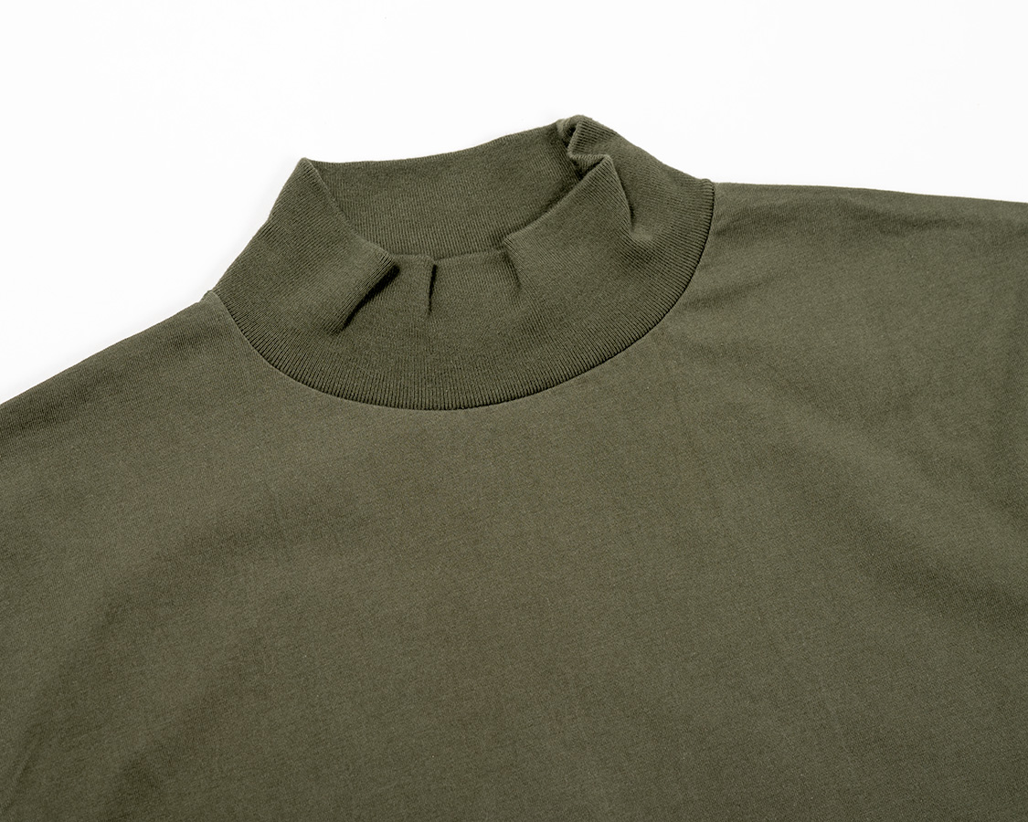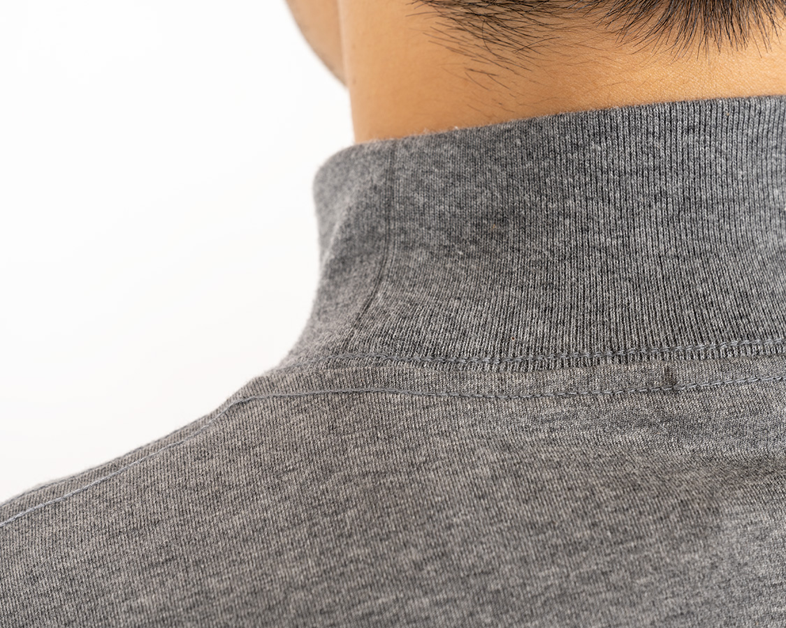 モックのポイントは「頭は通る、でも首にしっかり沿うネック」。そのために、身頃より伸縮性が良いフライス(リブ)を首に使う。それを、身頃のネックより小さいものを伸ばしながらつける。結果、ビヨンと戻る。カットソーは、生地の伸縮率の違いを意識してそれを伸ばしながらつけることで、「ここを通る時は伸びるけど、そのあとは戻る」が大事です。