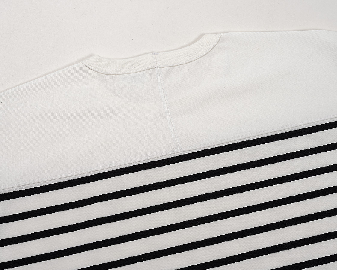 着ると、パネルボーダーやバスクと呼ばれるような、首回りがボーダー柄の無いデザイン。シルエット自体は、Crew NeckのボーダーTと同じなので、同サイズを選んでいただけます。