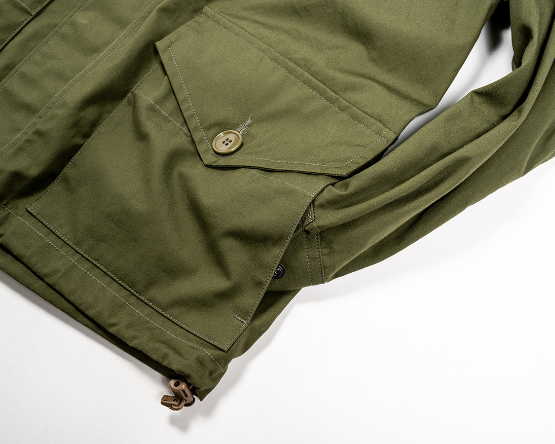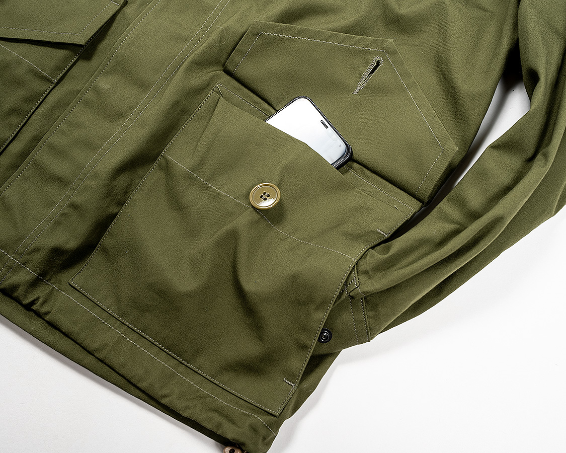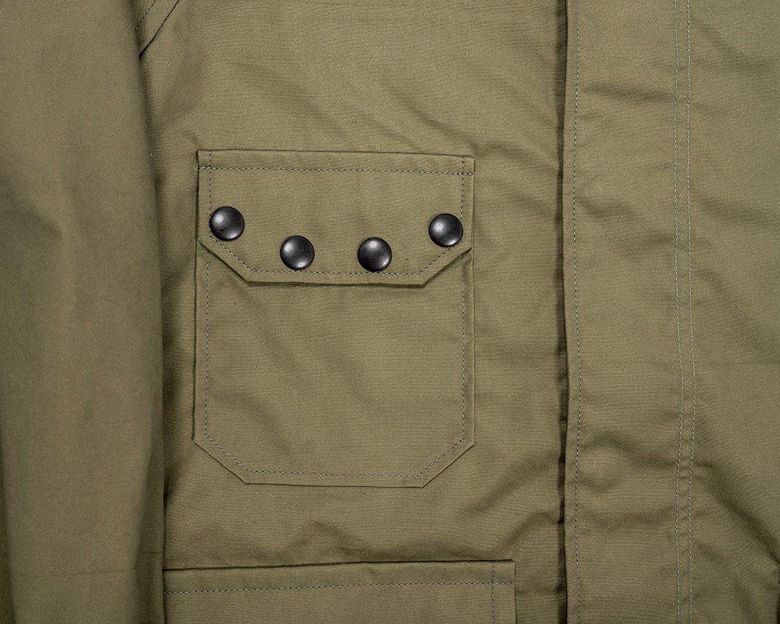 胸にスナップをたくさん打ったフラップポケット。オリジナルは縦方向にフラップだけがついていて、一説にはヘッドセットのコードを止めると言われています。そのままだと、使い道が無いので角度を変えてポケットのフラップに転用。