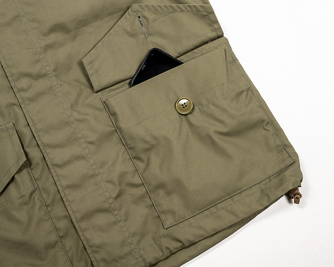 腰の二重ポケット。脇側からハンドウォーマー。フラップ側は物が入る。