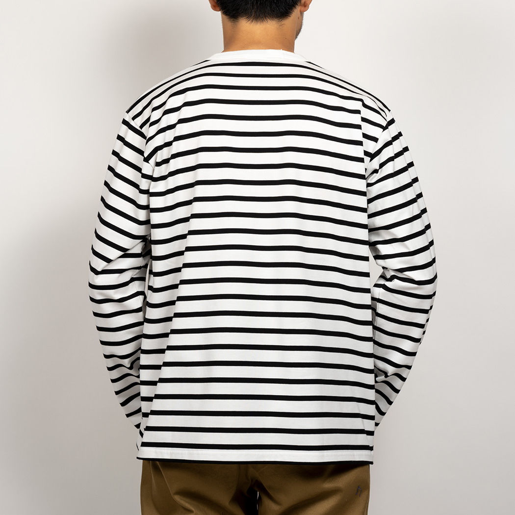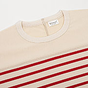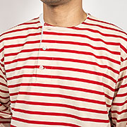 形は、クルーネックが長袖・ 半そで。こちらは定番。首のリブをがっしり厚い物にして、ボーダーの濃色部分が透けづらいように。ヘンリーネックは、 昨季、厚手のカットソーでも作った中心からオフセットしたもの。ボタンを開ければ着脱ぎが楽。締めれば首回りはしっかり収まる。カットソーを作る時の命題 「頭は通る、でも首回りにはしっかりフィットする」の一つの回答がヘンリーネックです。
