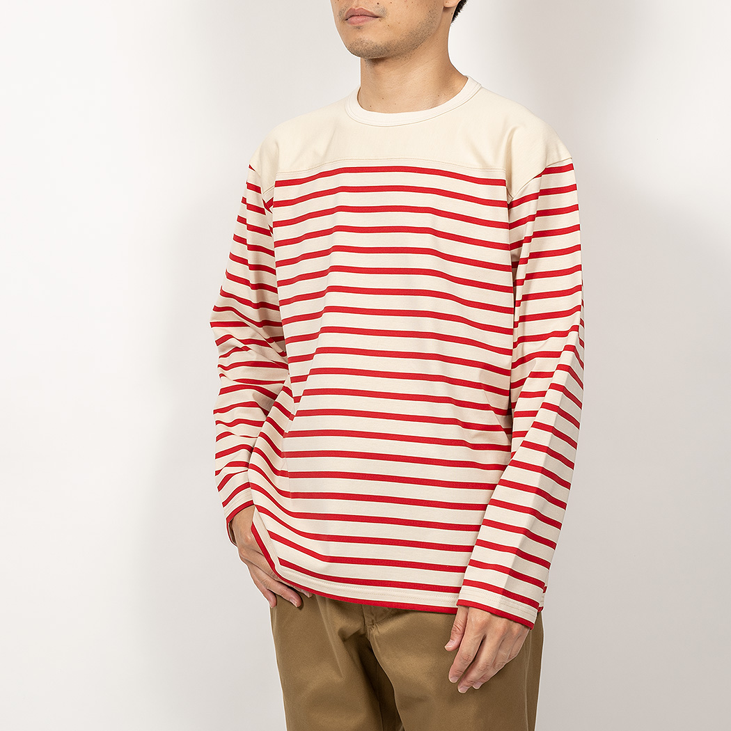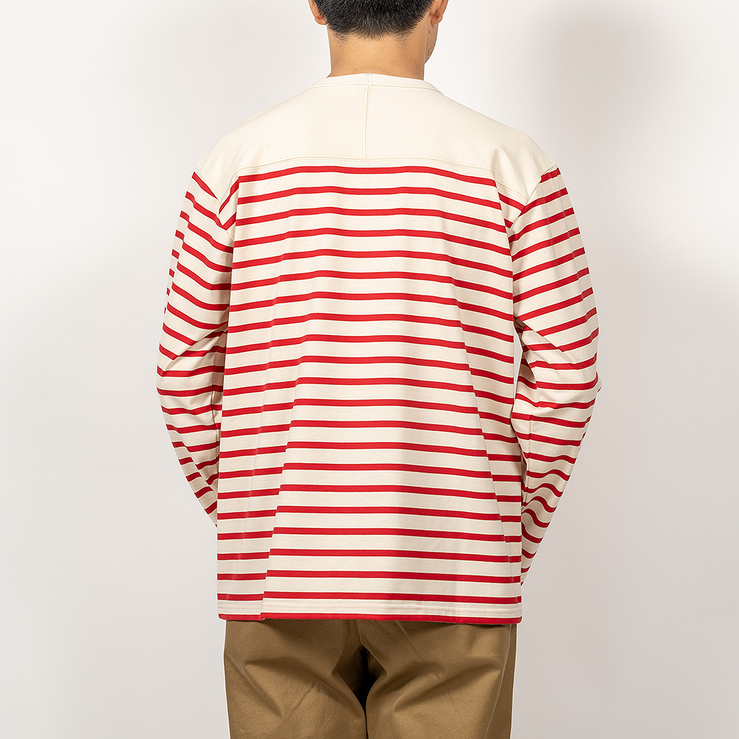 形は、クルーネックが長袖・ 半そで。こちらは定番。首のリブをがっしり厚い物にして、ボーダーの濃色部分が透けづらいように。ヘンリーネックは、 昨季、厚手のカットソーでも作った中心からオフセットしたもの。ボタンを開ければ着脱ぎが楽。締めれば首回りはしっかり収まる。カットソーを作る時の命題 「頭は通る、でも首回りにはしっかりフィットする」の一つの回答がヘンリーネックです。