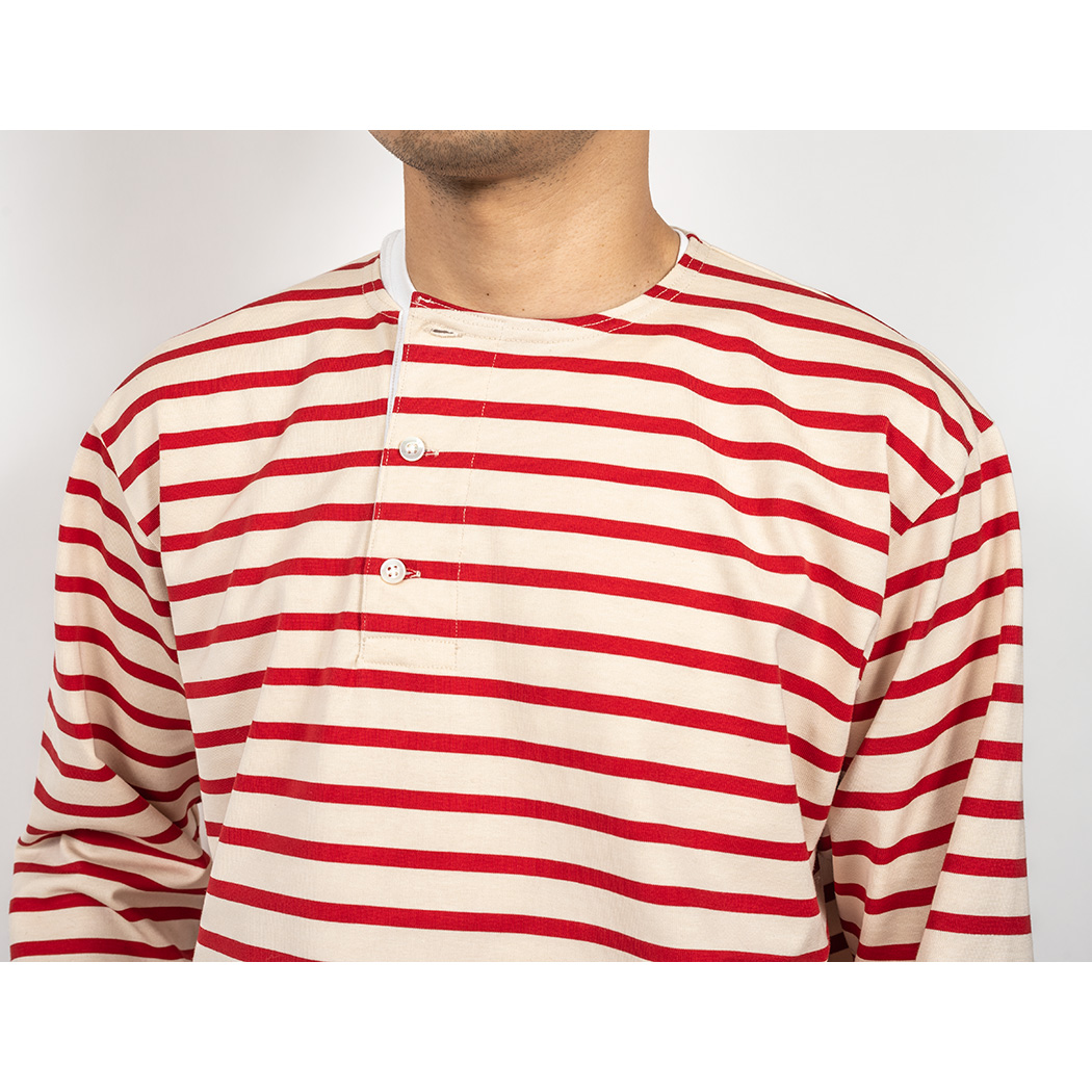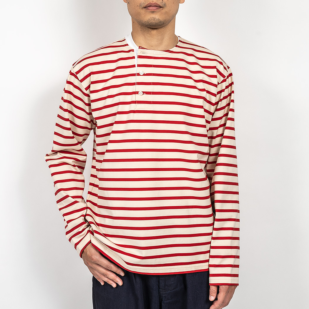 形は、クルーネックが長袖・ 半そで。こちらは定番。首のリブをがっしり厚い物にして、ボーダーの濃色部分が透けづらいように。ヘンリーネックは、 昨季、厚手のカットソーでも作った中心からオフセットしたもの。ボタンを開ければ着脱ぎが楽。締めれば首回りはしっかり収まる。カットソーを作る時の命題 「頭は通る、でも首回りにはしっかりフィットする」の一つの回答がヘンリーネックです。