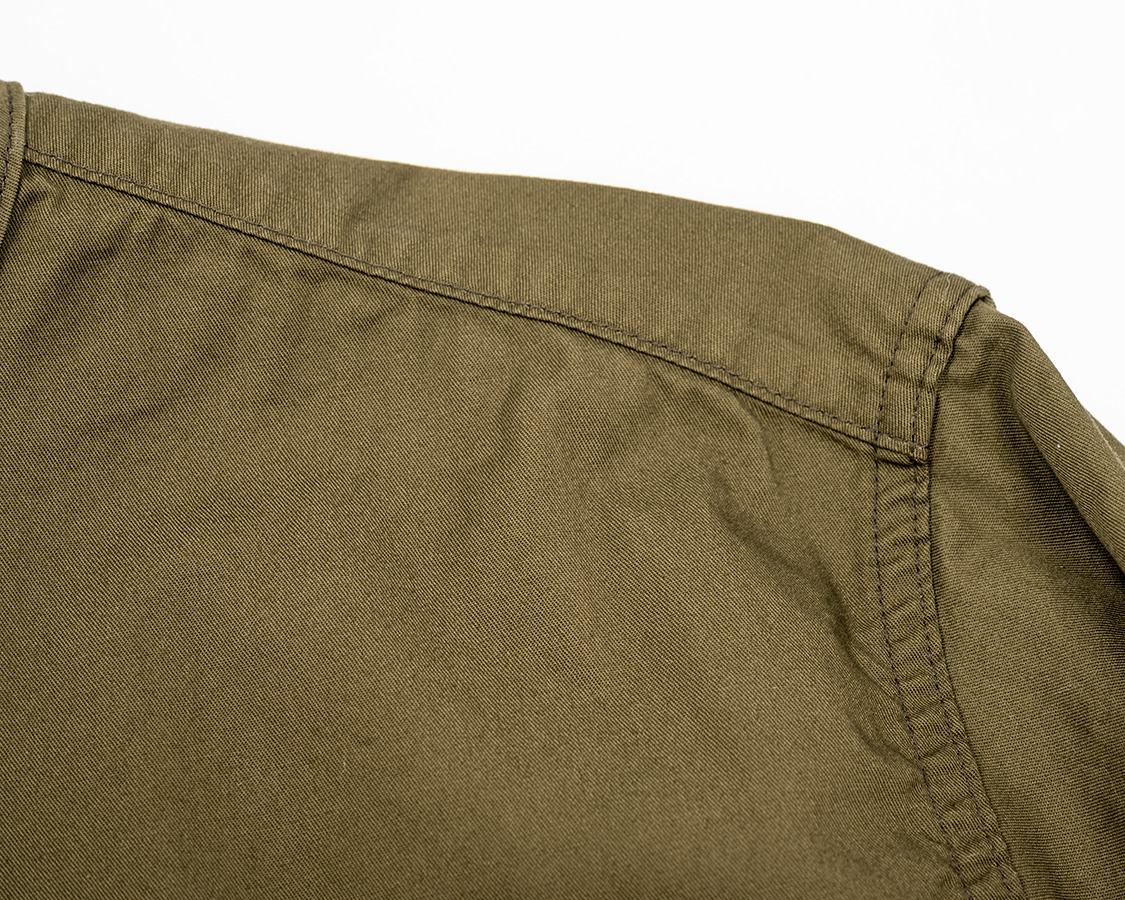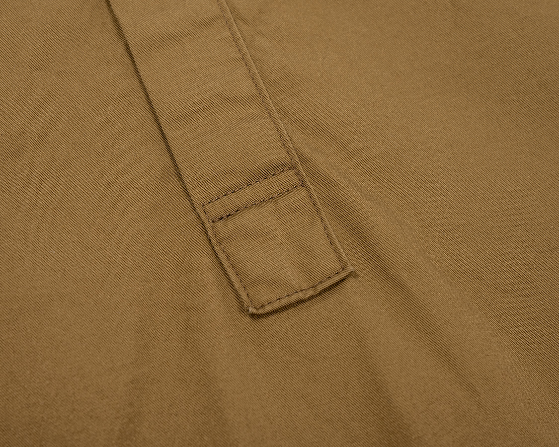 フロントはプルオーバー。チェーンステッチやラッパ(金具)は使わないで、完全に手作業で作られています。このシャツのシンプルな雰囲気によく合った仕様。