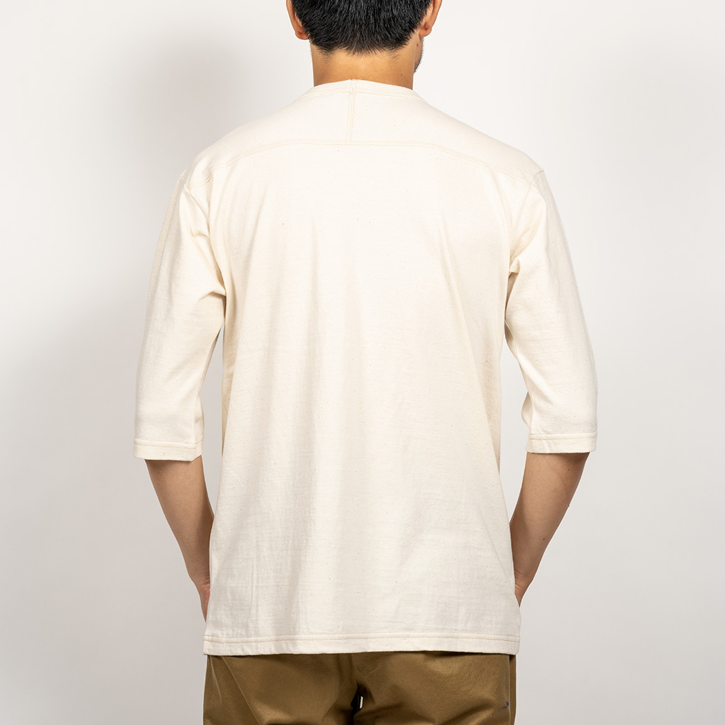 19番単糸・ラフィ糸を使った6 オンス天竺。柔らかで適度な厚みのある天竺生地はWORKERS・T シャツの定番素材。ラフィという糸、長繊維のいわゆる「良い糸」にあえて、糸づくりの工程で落ちた短繊維を混ぜて糸にしています。