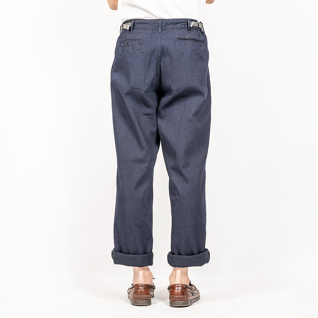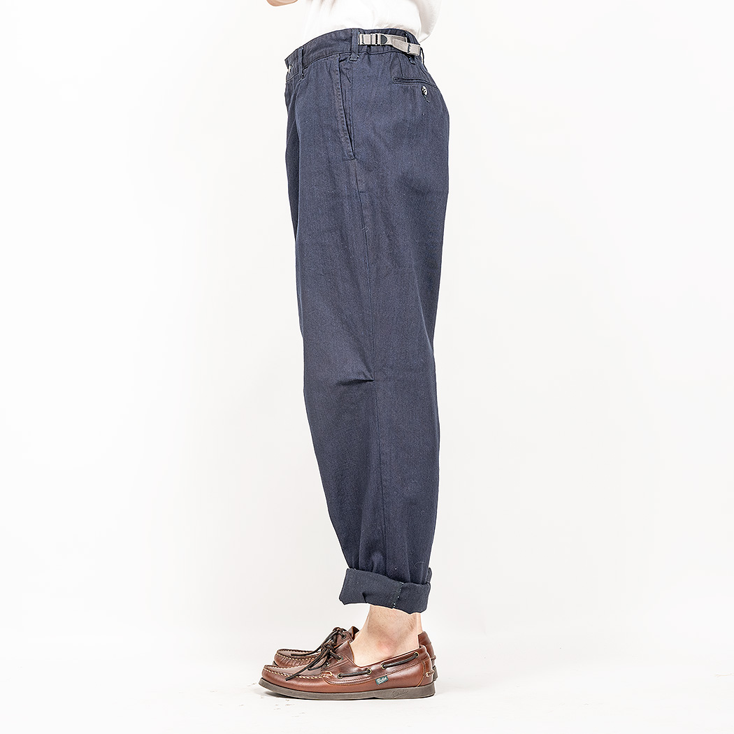 夏にはける、ゆったりと、薄手で、ウェスト調節にベルトの要らないパンツ。そこで、Fatigue Trousers を作ったのですが、 脇のカーゴポケットは着る機会を選ぶ。そこで「Wituout Cargo Pocket」が始まりました。