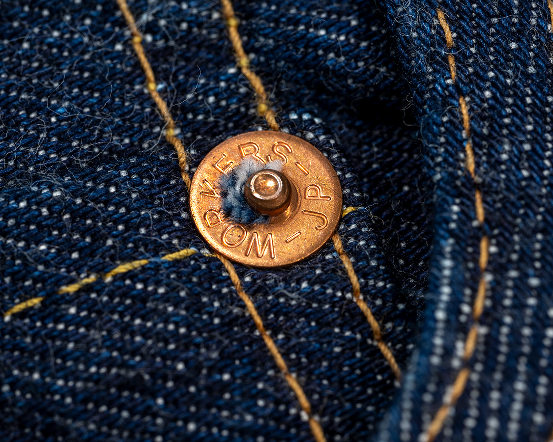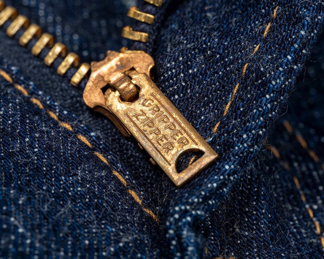 タックボタンは通称ジンク、亜鉛合金。リベットは胴。どちらもYKKにオリジナルのデザインで作ってもらった物です。ファスナーはいかにもアメリカっぽいですが、国産です。