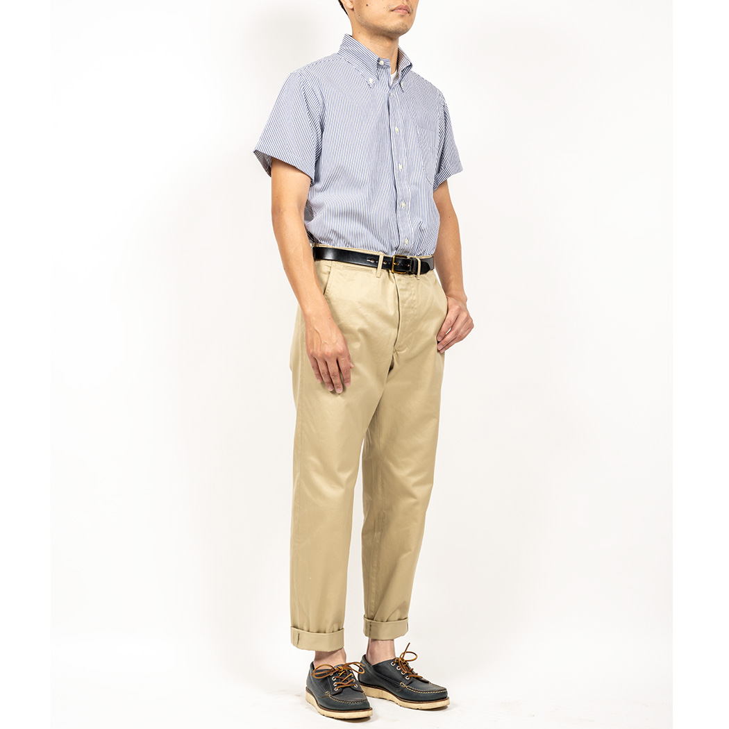 半そでBD にコットンパンツ、ローファーを合わせた組み合わせは私にとって強烈 な「アメリカントラッド」「アイビースタイル」の印象を残しています。 半袖だから当然ラフ、砕けた雰囲気だけど、襟がついて少しドレス風味。そこに、スポーツシャツ的なオックス。 WORKERS定番の5 オンス系より少し薄く、3-4オンスのライトオックスを選びました。