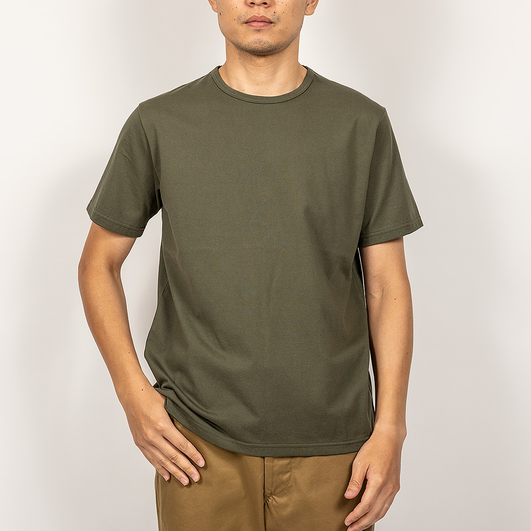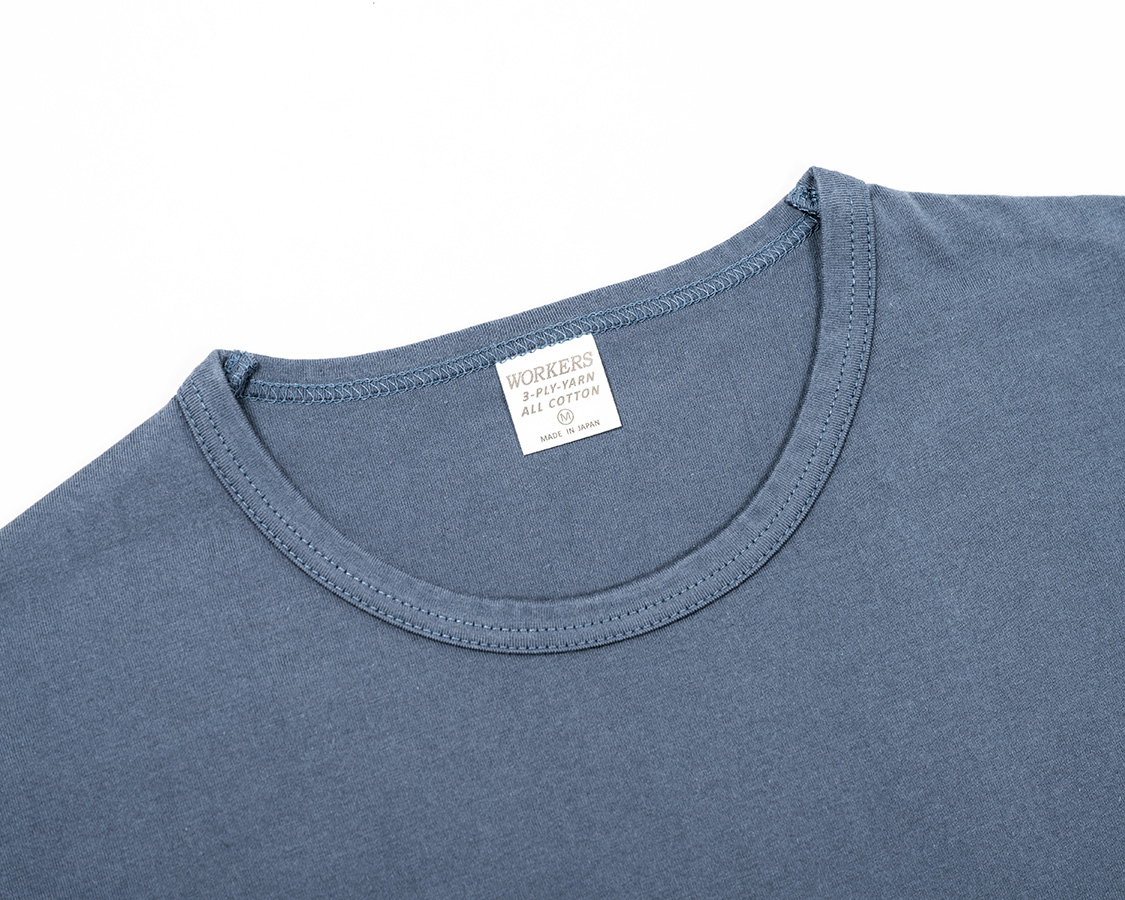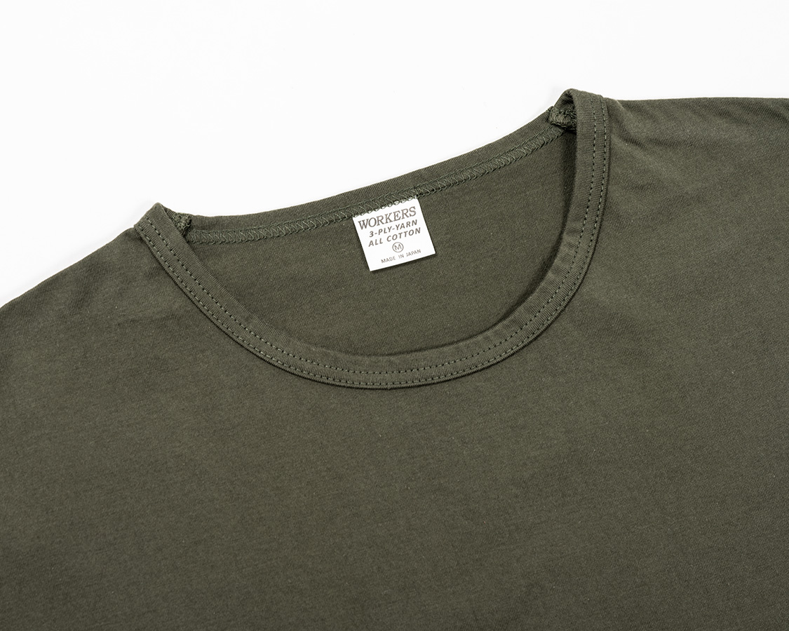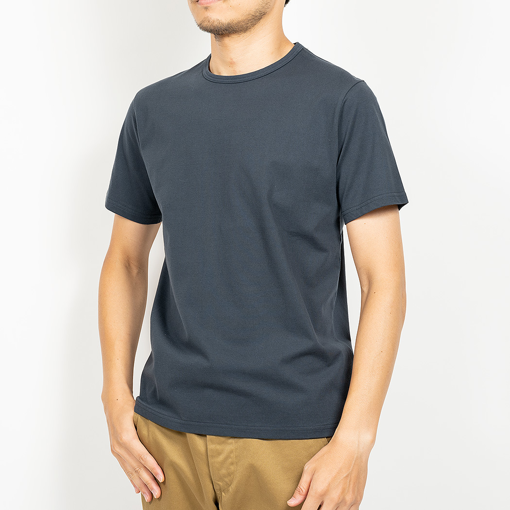 Slim Fit はシャツジャケットの中に綺麗なT シャツを着たいというのが発想の原点。生地に伸びはありますが、戻り(キックバック)が良いので形崩れしづらい。Slimは首回りの縫製を他のFitと変えています。先に前・後ろの首回りを細くバインドして後から肩をつなぐ。つないだ肩は首から肩先まで倒しのステッチを入れる。こうすると、着た時に左右の作りが同じ、左右対称になる。倒しのステッチがあるので、サイドネック(肩線・首の付け根)で縫い目が固くなり立ってしまうのを防ぐことができます。