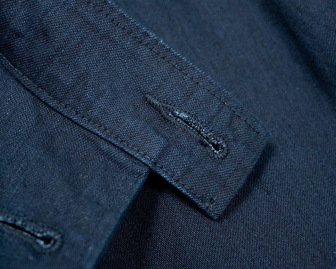 チンストラップ部分のアップ。デニムはいわゆるインディゴデニムとは違う硫化染めも入った物。色味が違うのがアップで見るとよくわかります。