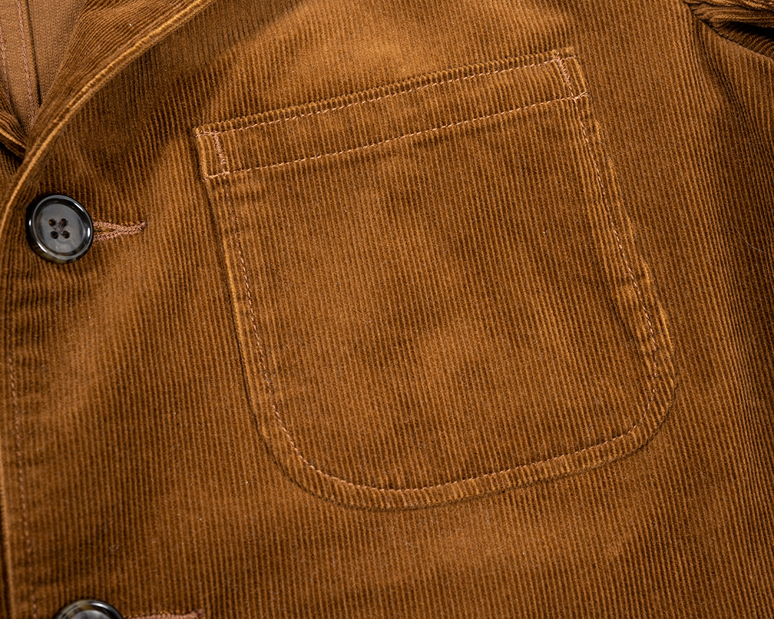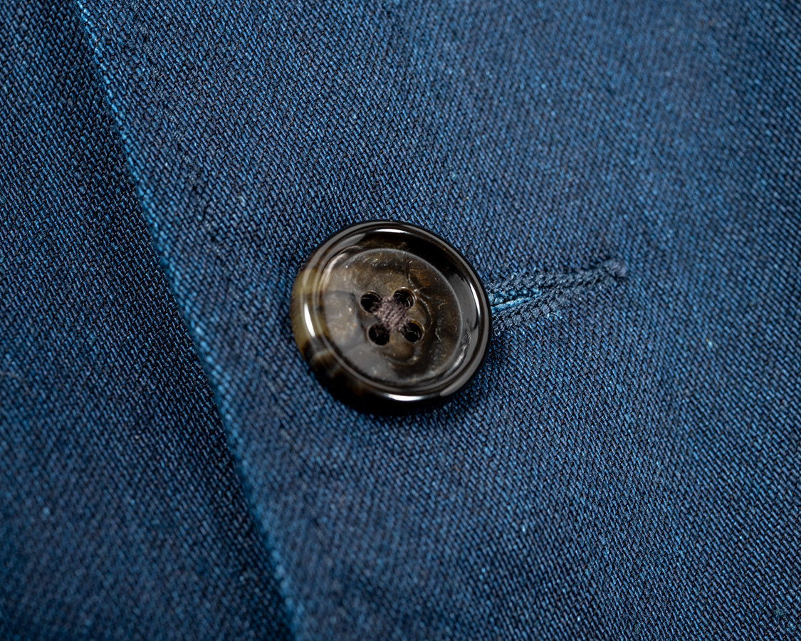 ボタンは樹脂で水牛風のマーブル模様。カバーオール的なラフなジャケットなので扱いのしやすさを考えて。