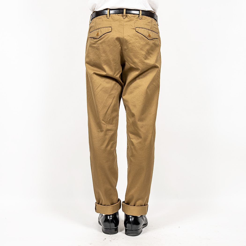 素材は定番のチノ 。USMC KhakiはWORKERS別注で、古着のUSMCと思われる茶系のベージュの個体から色を取ったもの。いわゆる「チノパン」のもう少し白いベージュとは違う。より土臭い雰囲気。