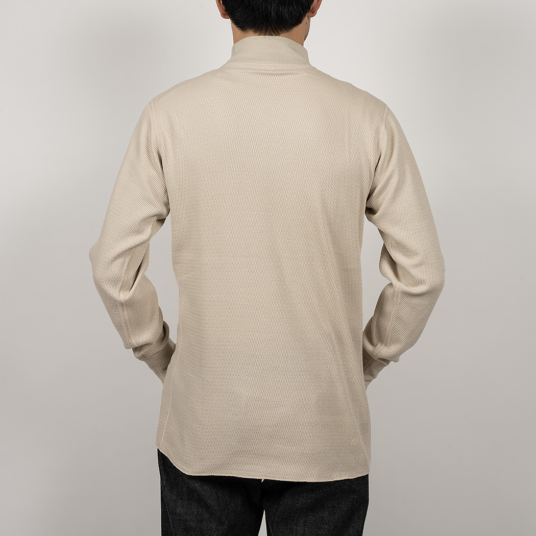秋口には一枚で着て、上に USN Shirt Jacket のような軽い羽織りもの。もっと寒くなれば、モックネックを Outdoor Shirt のインナーに。年取ると、「首」がつく部分は暖かくしていたほうが具合が良い。首は年齢がもろに出るので、そこ をうまく隠しながらちょっと洒落た感じにも見えるモックネックはお勧め。だた、モックネックの難しさは「きつすぎる と苦しくて気持ち悪い」「緩すぎるとだらしなく見える」。ちょっと伸びたモック、若い子がしてるとそれはそれでカッコ イイのですが、おじさんがしてるとう〜ん。そのあたり、型紙・リブの素材で調整しています。