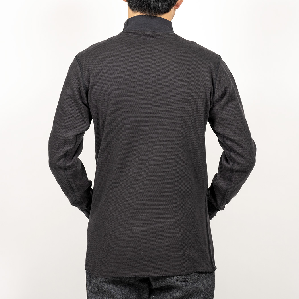 秋口には一枚で着て、上に USN Shirt Jacket のような軽い羽織りもの。もっと寒くなれば、モックネックを Outdoor Shirt のインナーに。年取ると、「首」がつく部分は暖かくしていたほうが具合が良い。首は年齢がもろに出るので、そこ をうまく隠しながらちょっと洒落た感じにも見えるモックネックはお勧め。だた、モックネックの難しさは「きつすぎる と苦しくて気持ち悪い」「緩すぎるとだらしなく見える」。ちょっと伸びたモック、若い子がしてるとそれはそれでカッコ イイのですが、おじさんがしてるとう〜ん。そのあたり、型紙・リブの素材で調整しています。
