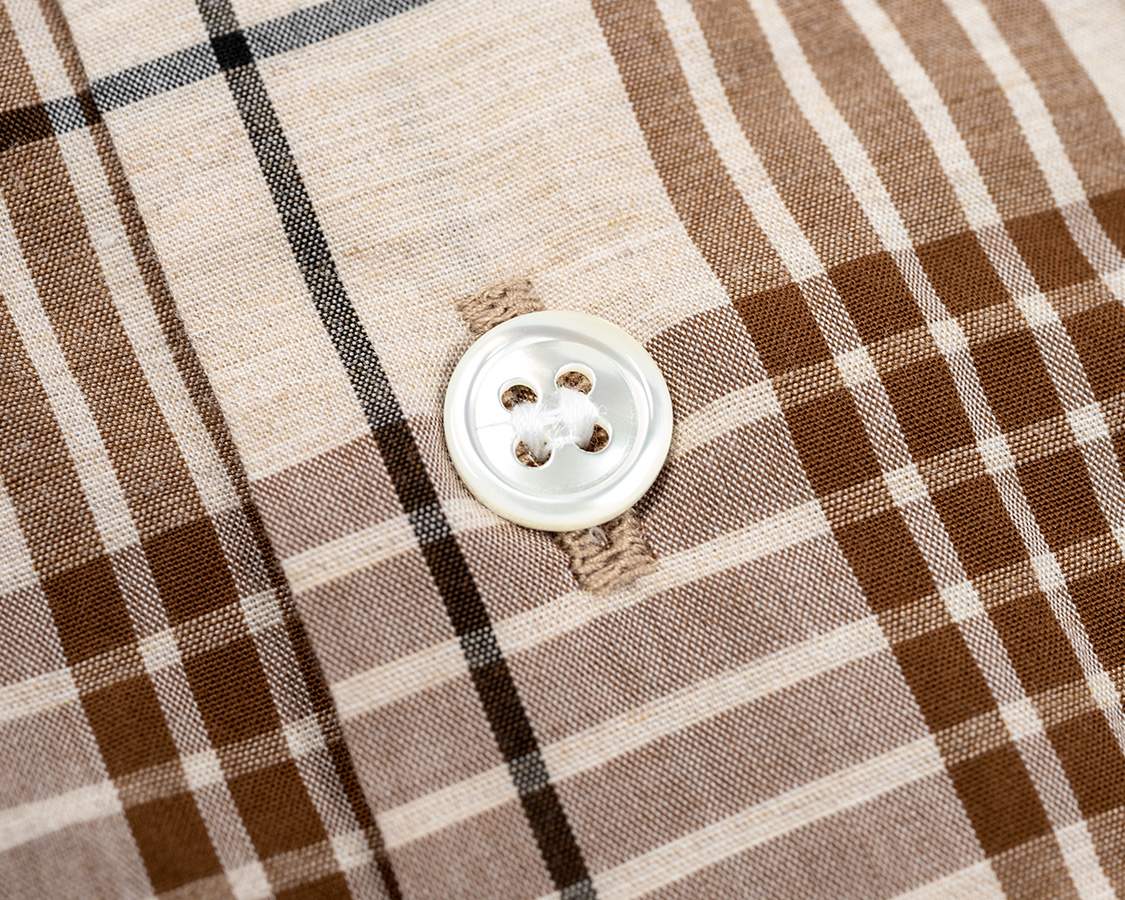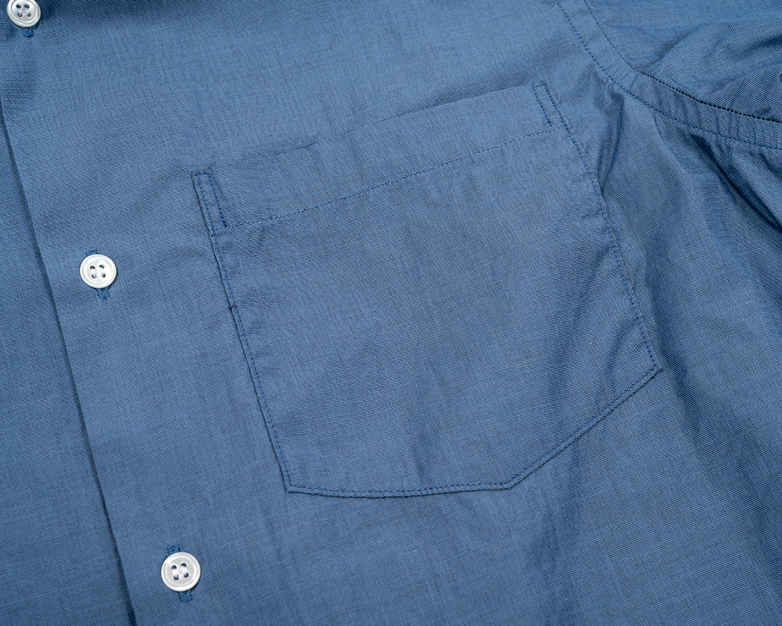 フロント、前立ては無く身頃を三つ折りしてホールで止める。このあたりがアメリカ物のシャツと違いを感じる部分。ステッチが無い分、シンプルかつドレスウェア的な雰囲気。ボタンは高瀬貝。なので、洗う時はネットに入れてください。