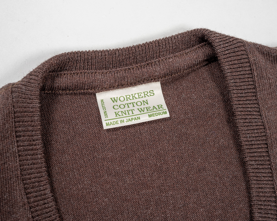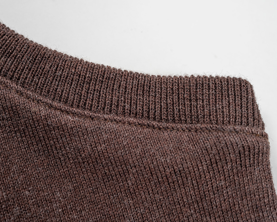 ブラウンといっても全部がブラウンではなく。アップで見ると微妙にトーンが違う。「トップ染」と呼ばれる、ワタで先に染めてから糸にするのでこのような風合いになります。