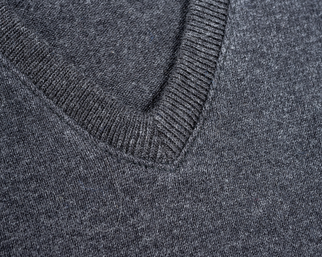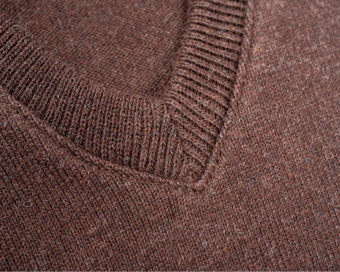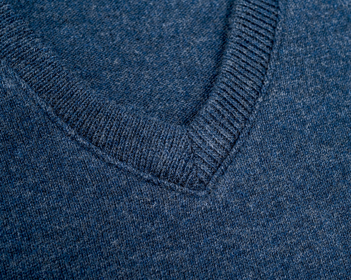 前Vの突端。身頃の天竺、首回りのフライス、編みが違うのが良くわかります。