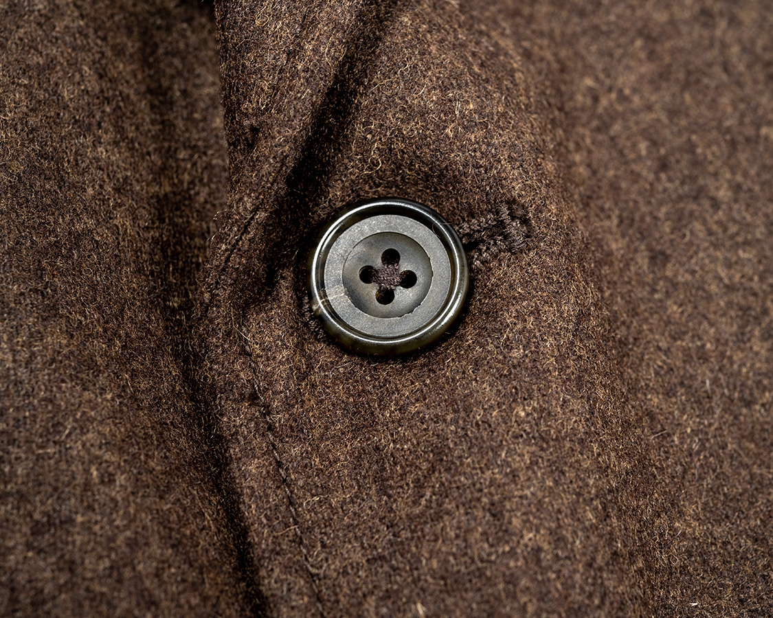 ボタンホールはハトメ+虫カン。非常に小さいカンヌキの事を通称「虫カン」と呼んでいます。ボタンホールの最初・最後を綺麗に隠しつつ強度を出すための仕様。