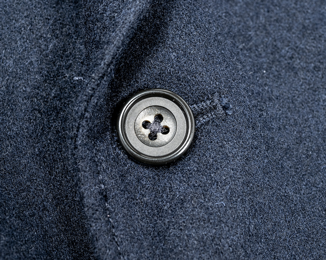 今回は三つボタン、上二つ掛け。ラペルロール部分のボタンアップ。