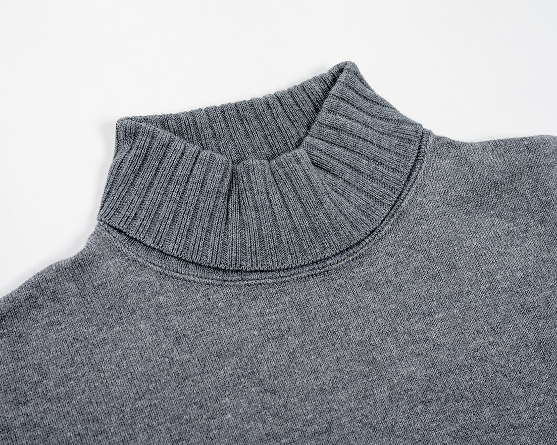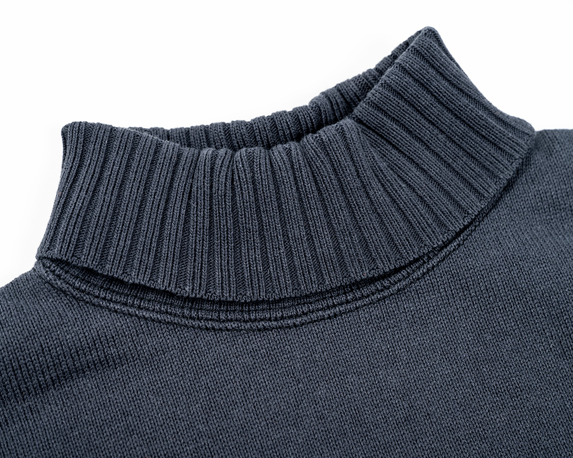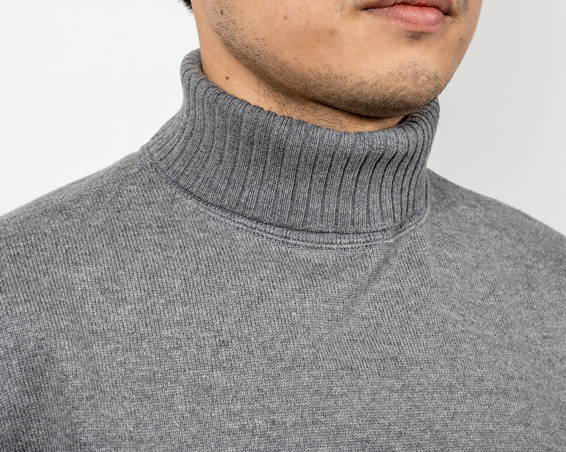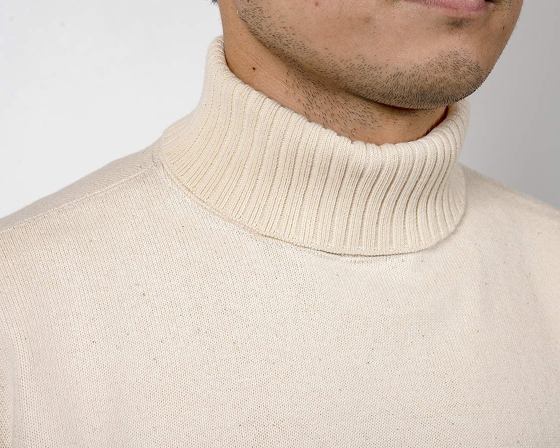 折返りのロールネック。きつすぎず、緩すぎず。高さも大事で、日本人はどうしても欧米人のように首が長くない。低すぎると、せっかくのロールネックがモックネックのようになってしまう。結局、パターンを何種類もひき、量産で使うのと同じ生地を用意して試し縫いを繰り返しベストなバランスを探しました。