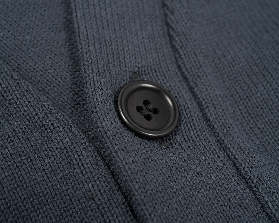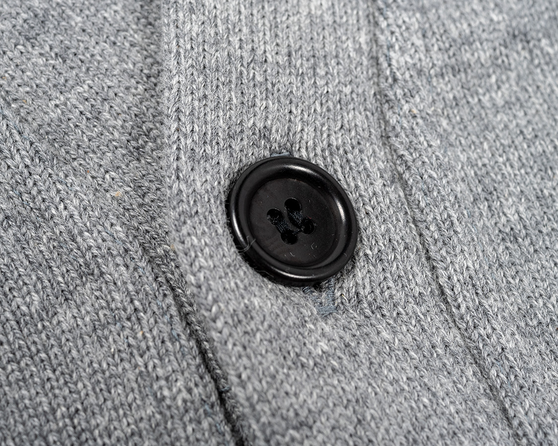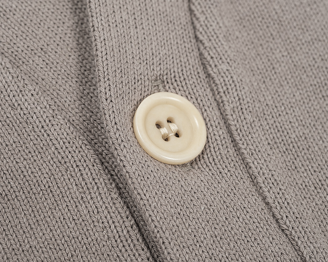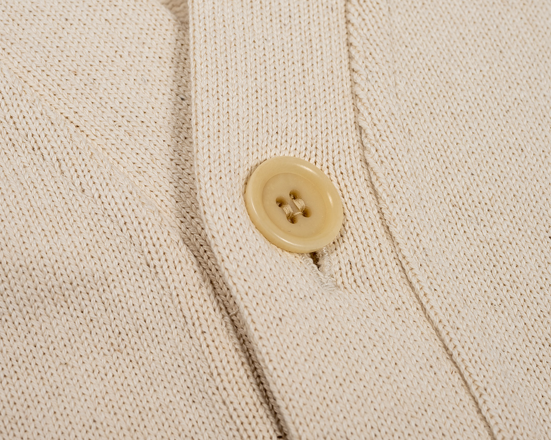 コロゾ椰子ボタン。ポリエステル樹脂にすればもっと安いのですが、身頃のコットンのざっくりした天然繊維の風合いとボタンの風合いも合わせたく、悔いが残らないようコロゾ椰子にしました。