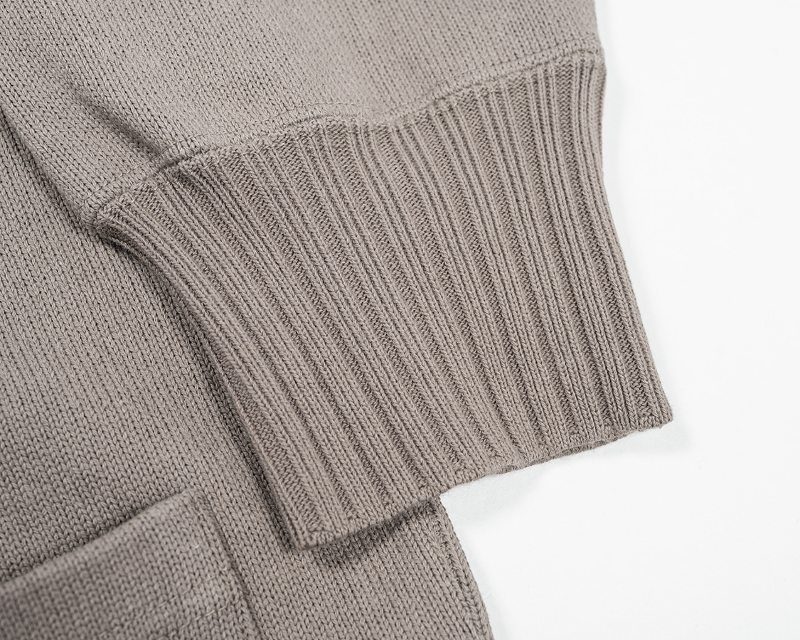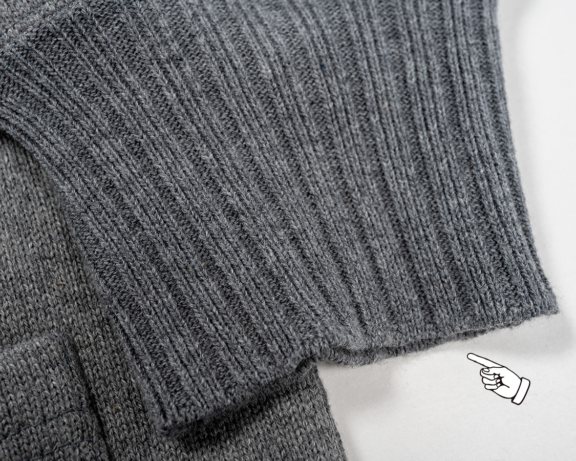 袖口リブは「横編み」という、いわゆるセーターを作るのと同じ編み機で編みます。ポイントは編みどまりを作れること。矢印の部分が編みどまっています。