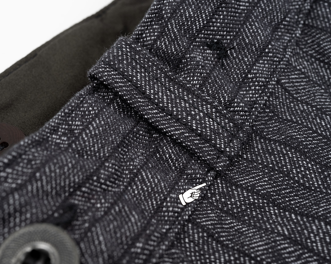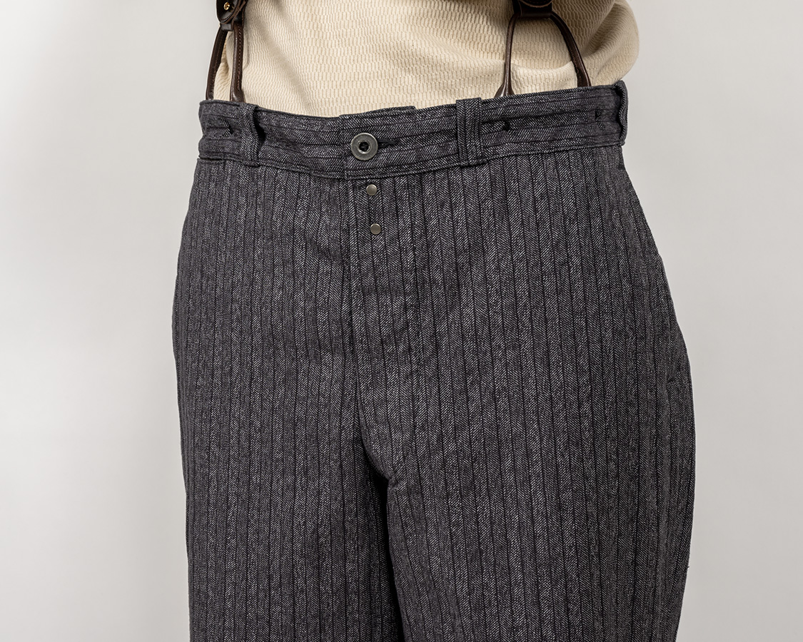 参考にしたおそらくヨーロッパ物だろうなというトラウザーズにならい、フロントはボタン+フック。股上は深め、ウェスト裏にサスペンダーボタンあり。吊った時の雰囲気はやはりとてもクラシック。ベルトで締めたのとは一味違います。