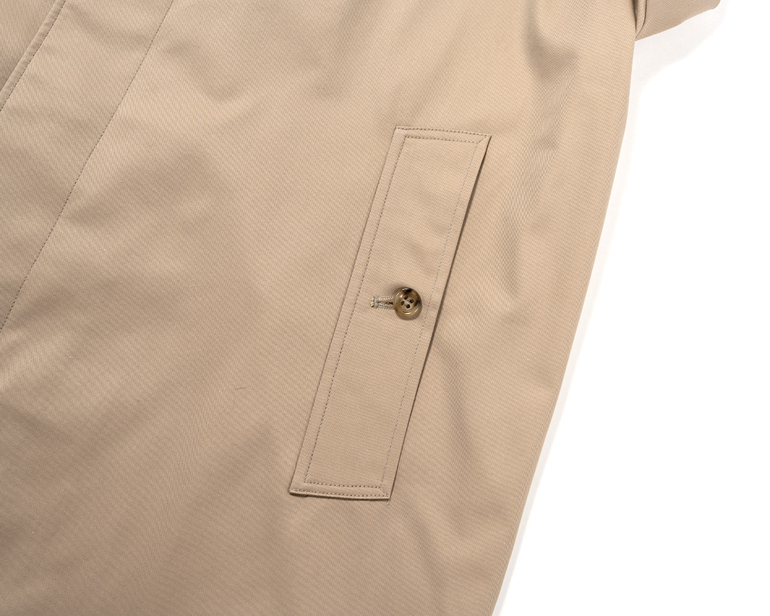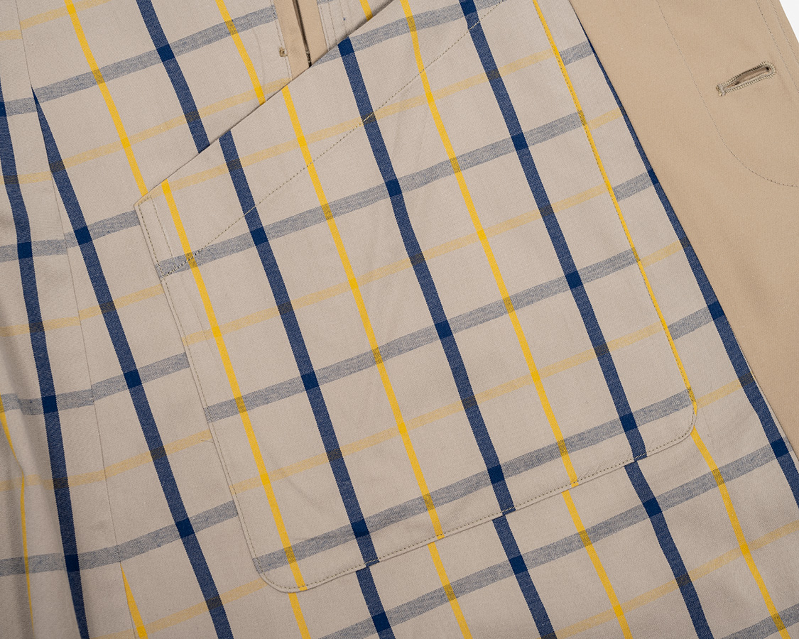 身頃裏、ギャバジンは別注で作っているチェック生地。ビンテージのブルックス、おそらくバーバリーに別注していたのではないか?という一枚を参考に兵庫県・西脇のTAKASEさんの親戚のおじさんに織ってもらったチェックです。