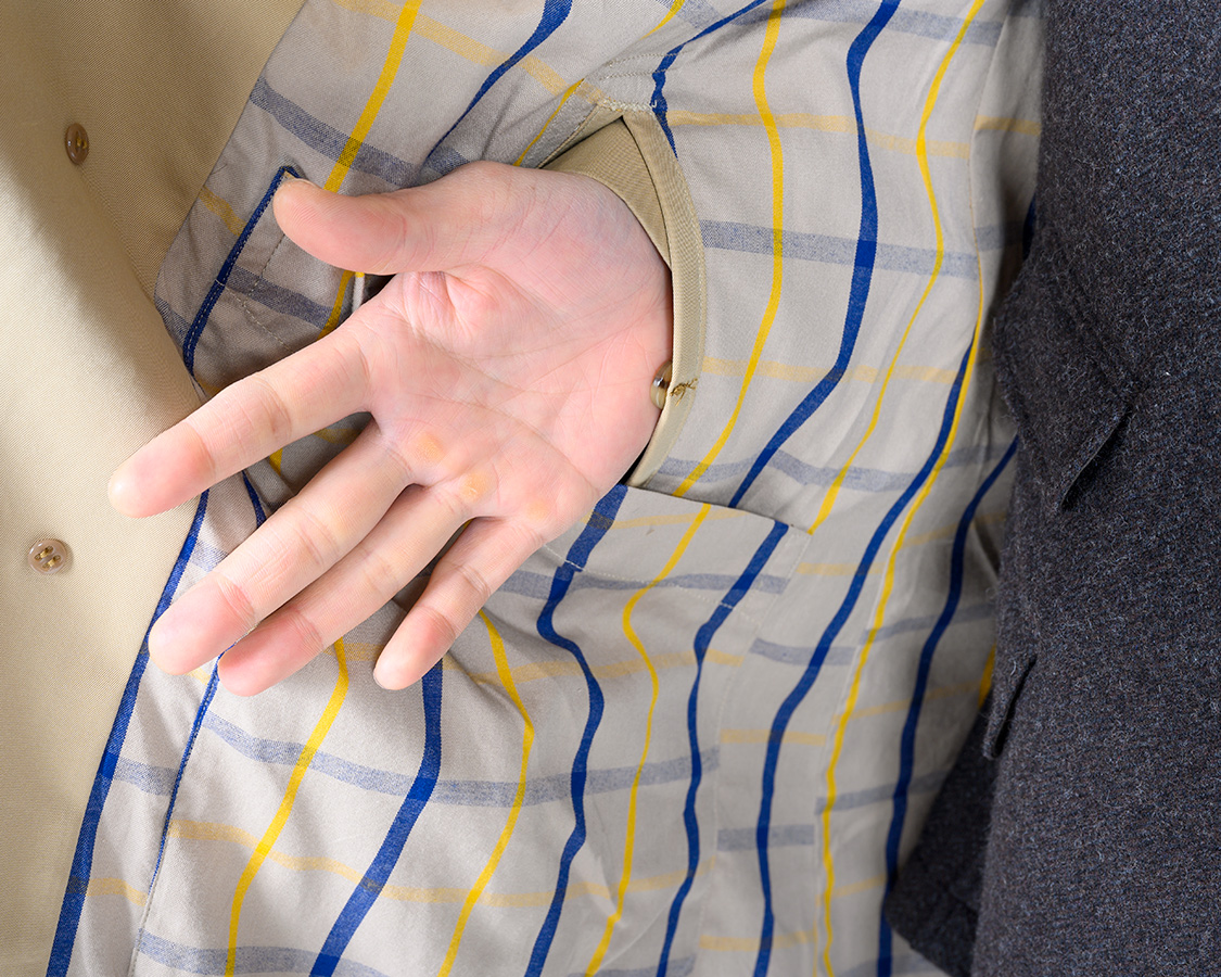 ポケットは貫通。貫通した先にポケットもあるので物も入る。コートの前を閉じた状態で、ズボンのポケットに触れるための貫通ポケット。