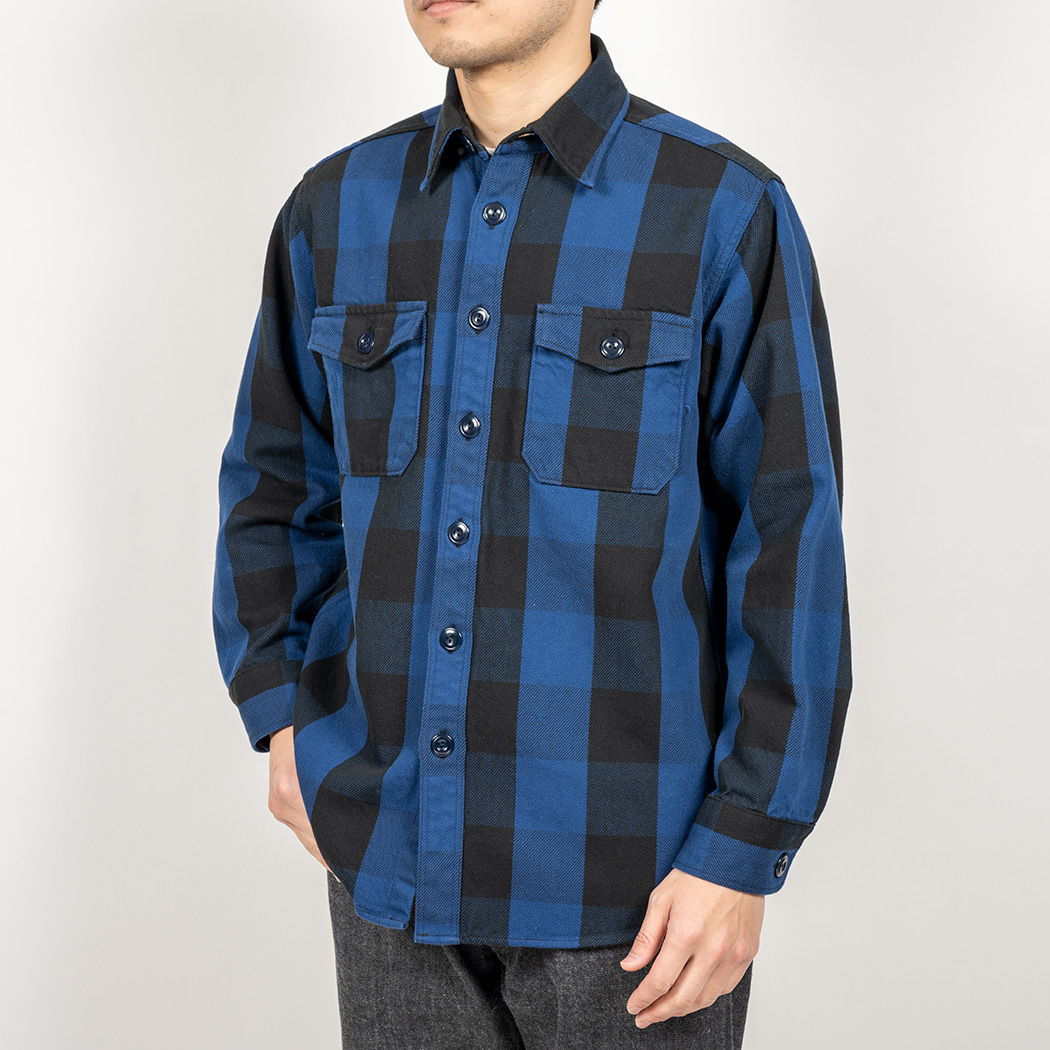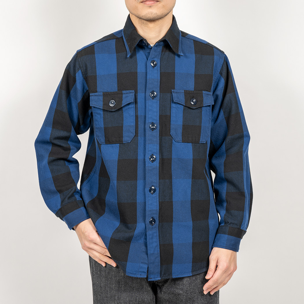 昔ビンテージショーで見た、バッファローチェックのウールシャツにUSNのカバーオールという人がとてもかっこよかった。その印象がずっと残っていて、あれをコットンでできたらなと思い形にしてみました。ただ、久しく作らなかったのは価格が高いから。生地幅が狭い×生地単価が高い×柄合わせで一着に必要なメーター多い×柄合わせ裁断でチャージアップと4重苦。だからチェックの厚手シャツは無地に比べて突出して値段が高いのです。