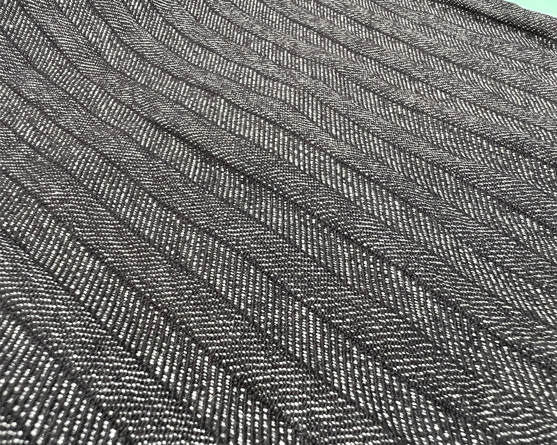 経糸(タテ糸)の一部に撚り杢糸。白・グレー味がかった黒糸をそれぞれ作り、その糸をよって一本の糸にする。その撚り杢糸と、通常の色糸。設計通りに並べ、緯糸(ヨコ)はタテに比べてかなり太い番手でヘリンボンに織る。