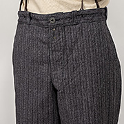 フロント、ボタンフライで金属ボタン+フック。このフック、俗に「フレンチの古着」などと呼ばれる物を見ると良くついています。機能性は微妙ですが、この生地に合った「らしさ」で使いました。見えづらいですが、右前身頃にコインポケットあり。ウェストはベルト+腰裏にサスペンダーボタン。ボタンはコロゾ椰子を削った、表面が平らな物。体が触れる側にできる限り突起をつけたくないので。