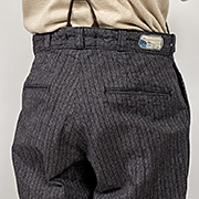 背面は細玉縁。身頃の縫い合わせは割り・倒しを使って巻き縫いは使わない。ヨーロッパ物で巻き縫いも無くはないですが、縫い合わせは少し稚拙なぐらいなほうがそれ「らしい」と感じます。このあたり、参考にした古着を見ながら「いかにもありそう」な仕様を選んでいます。中にサーマルを着てタックイン、寒くなればRAFSweaterやシャツ。そしてサスペンダーをしてフォレスティエール。