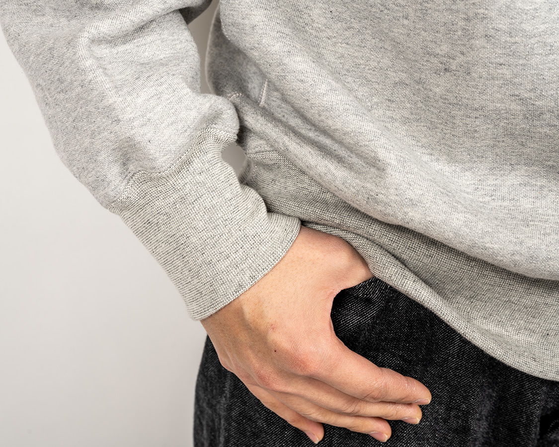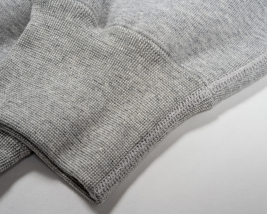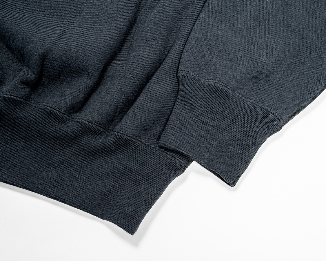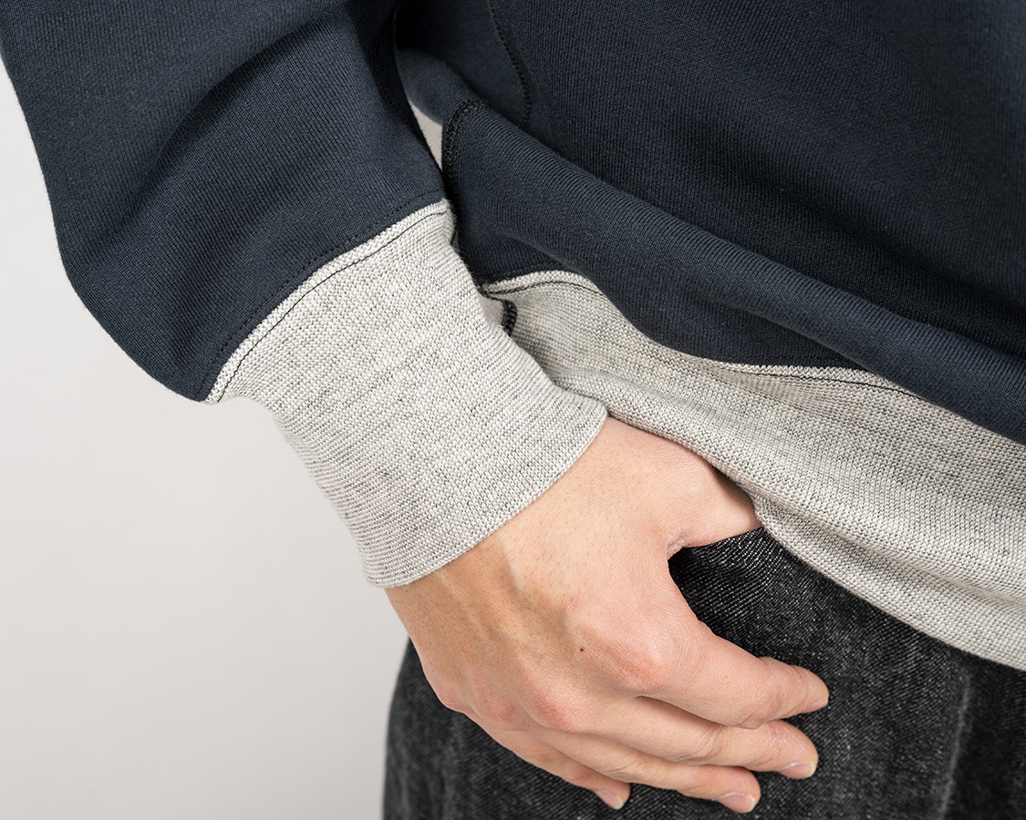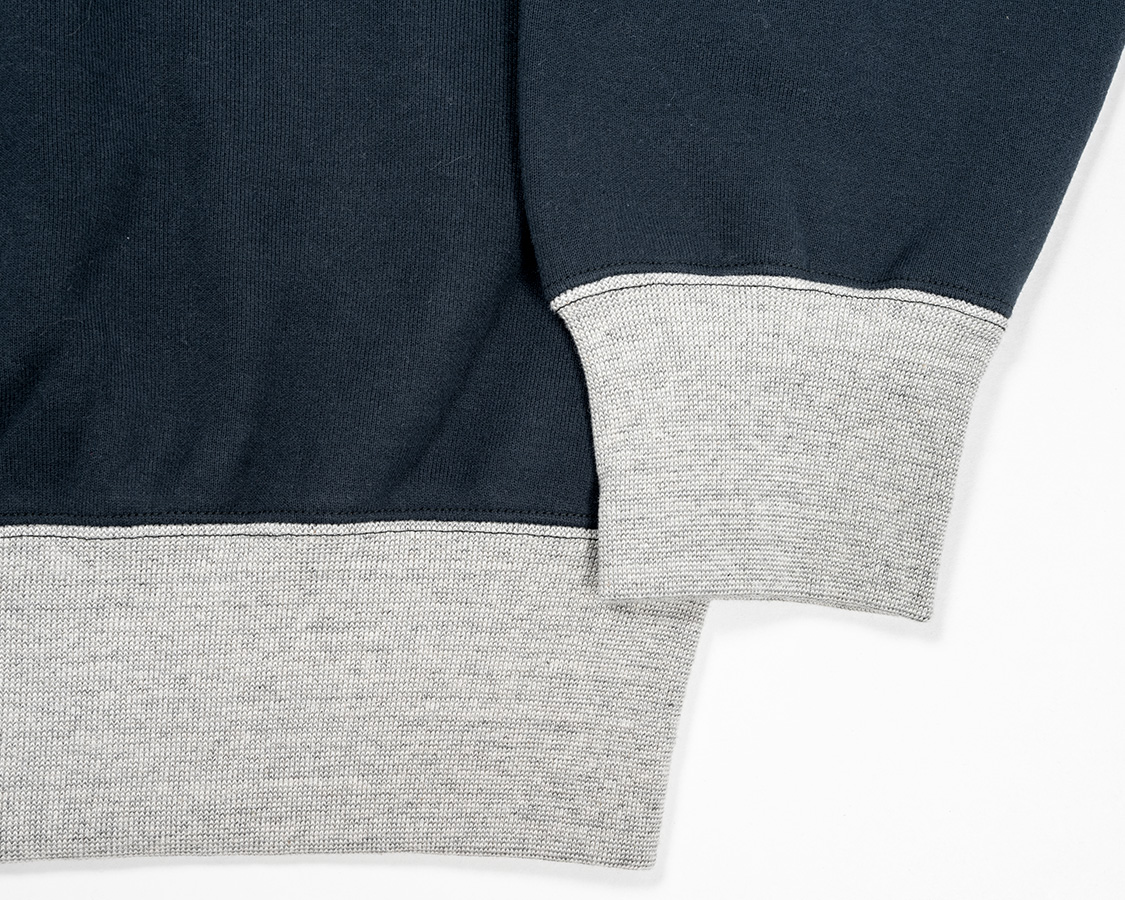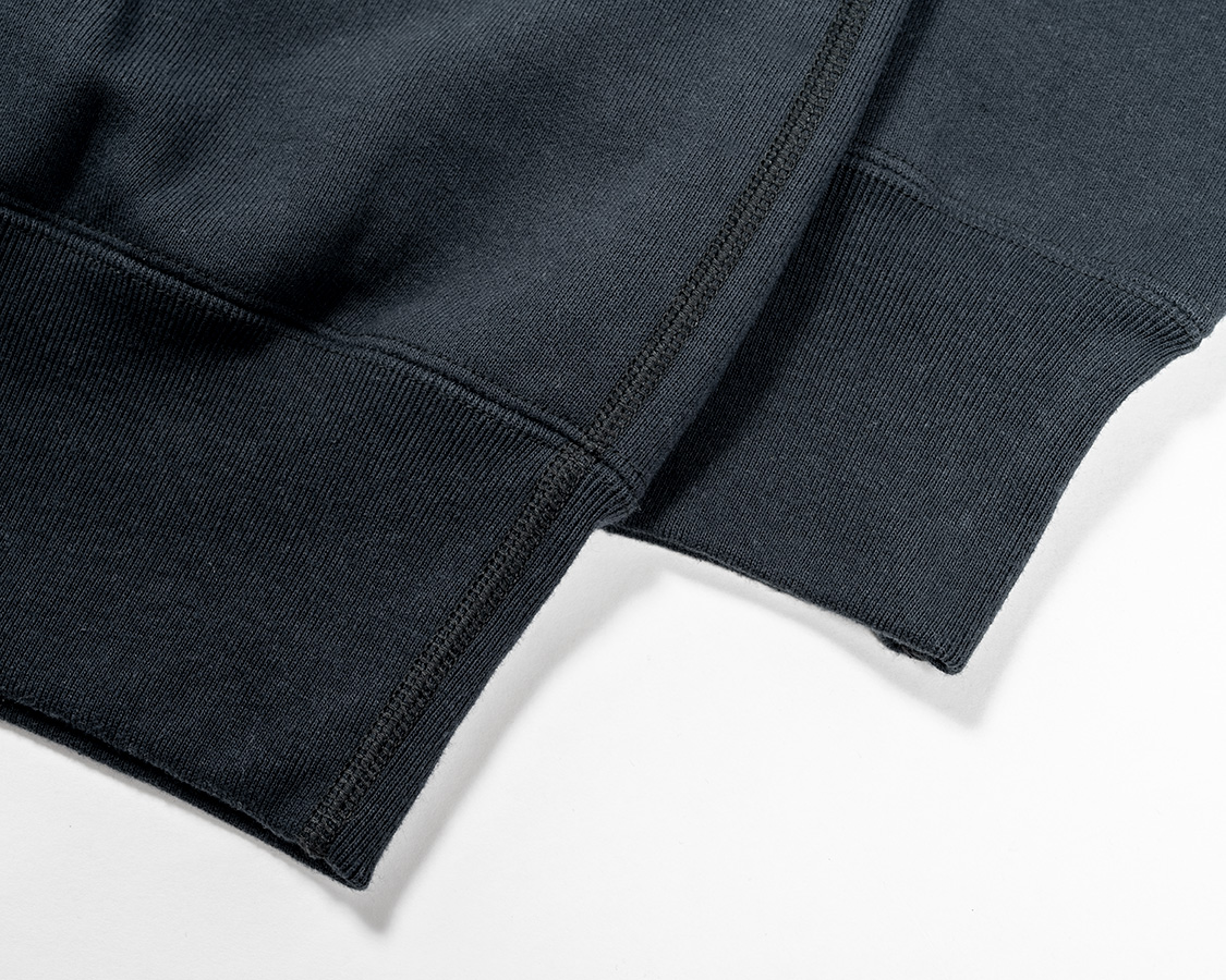 リブも身頃のヘビーオンスに負けない、がっしりした物。袖とリブの取り付けはオーバーロック+またぎ裏振り。リブ、身頃の縫い合わせはフラットシーマー。