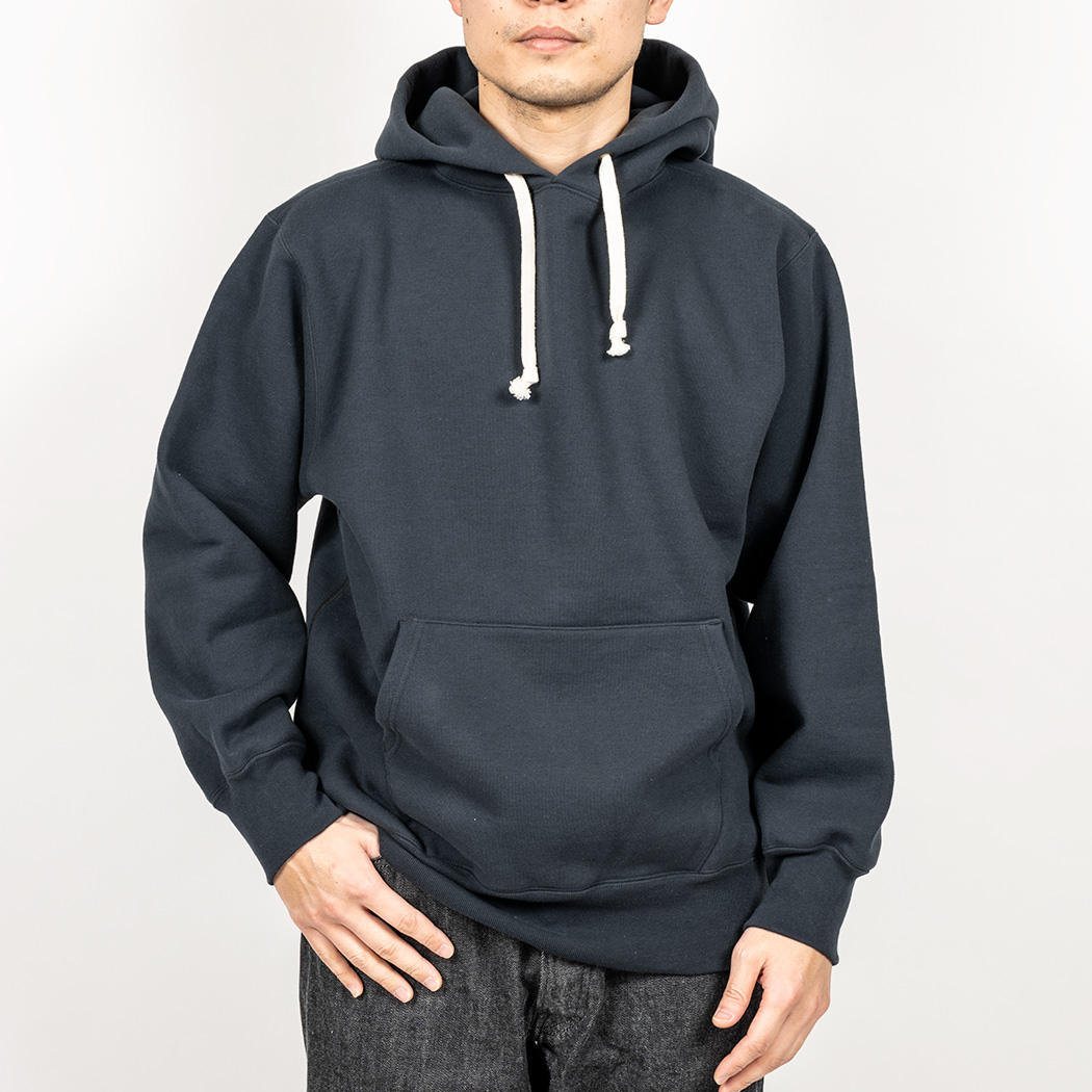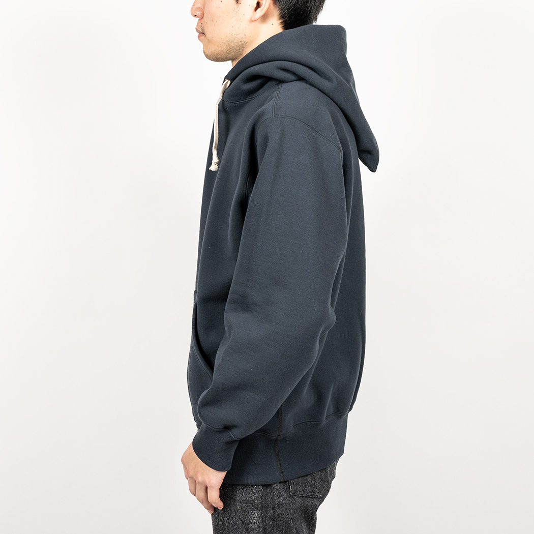 表30 番・中30 番・裏7 番で、裏の糸ループを短く編み、 さらに起毛をかけた本格的冬用スウェットです。ガチガチに目を詰めて編んでいるので形崩れしにくい。重さは15 オンス程あり、いわゆる「超ヘビーウェイトスウェット」
