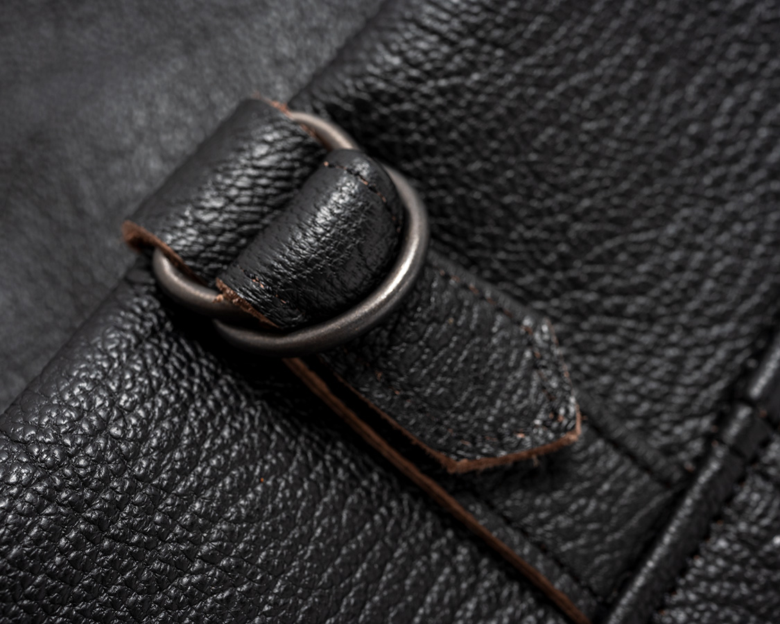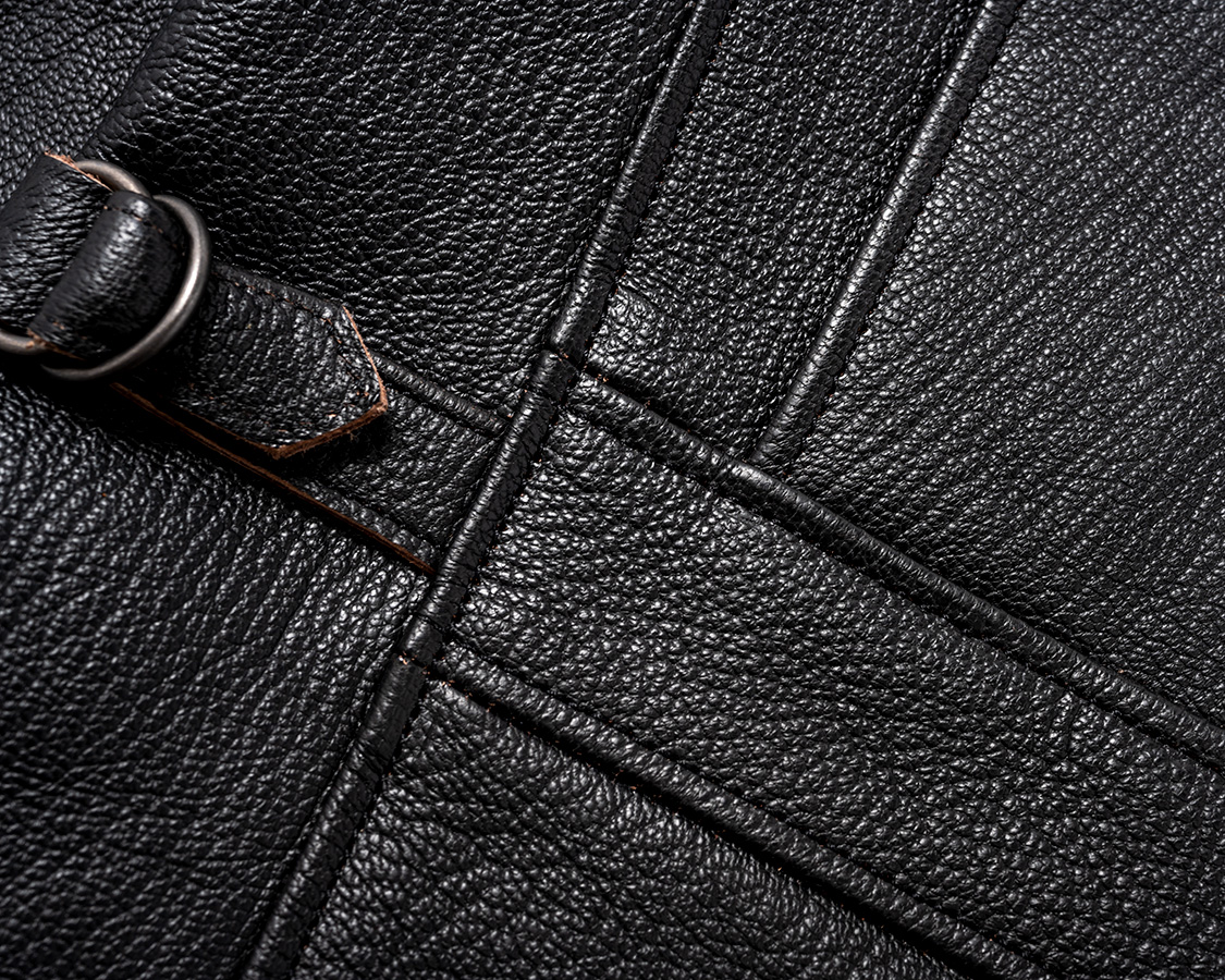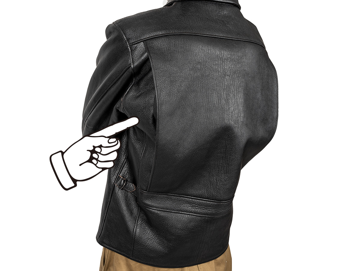 背ヨーク、アクションプリーツ入りの身頃。デザインでもあり、革の取り都合を良くする意味もあり、肩幅をある程度に抑えながら体が動いたときに背中が突っ張らないようにする機能性でもある。現代では素材自体、ストレッチが効いている物がほとんどですが、そういう機能が無かった時代、昔の人は良く考えたんだよなというデザイン。