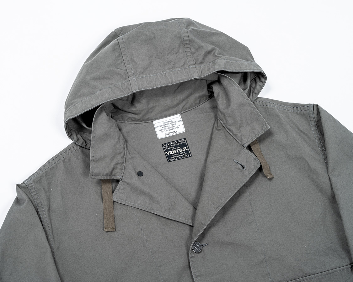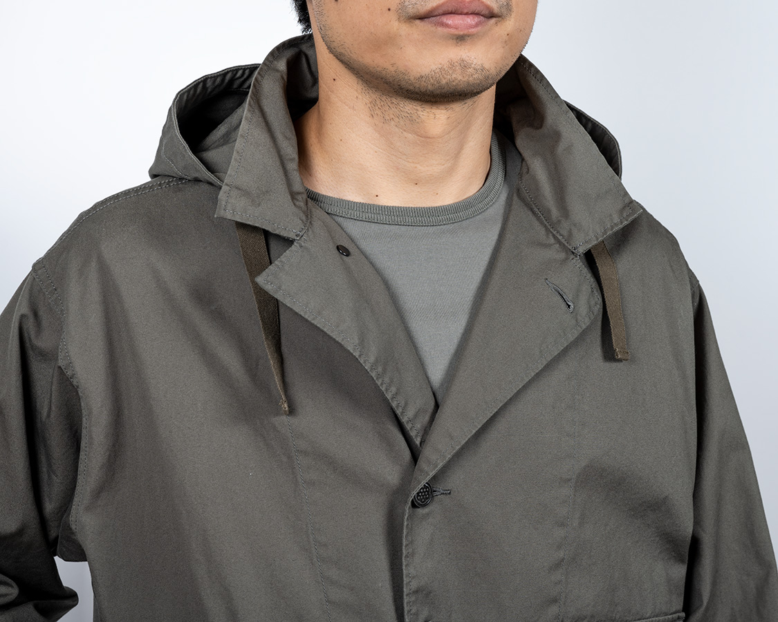 襟に切り替えがあり、そこにフードを挟み込んだ襟。もともと、アウトドアウェアで見かけた仕様をアレンジしたもの。