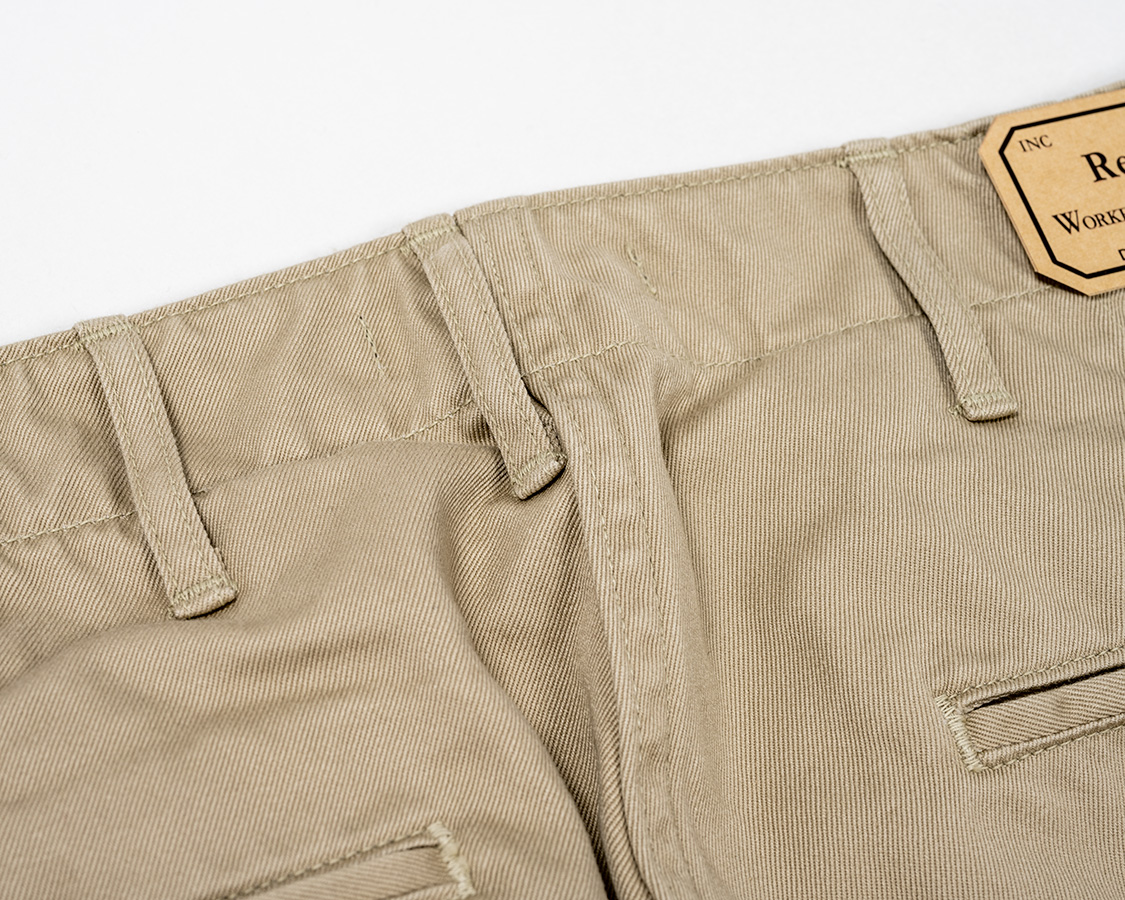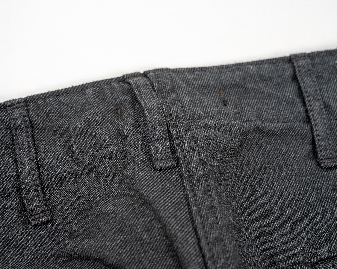 現代ではカンヌキミシンもパワーがあるので、実は真ん中に載せることもできます。ビンテージでも厚地に特化していたのだろうなという工場で縫われただろうものは真ん中にループ乗ってることもあります。でも、非力なミシンだろうと、パワーのあるミシンだろうとチノパンを作らせて調達しなければいけない・・・となると、ループは「所定の数が、ほぼ所定の位置についていさえすれや良い」のでオフセットもOKだったわけです。それが今となってはデザインであり、「ビンテージのチノパンであるよね」という定番に仕様になっているわけです。