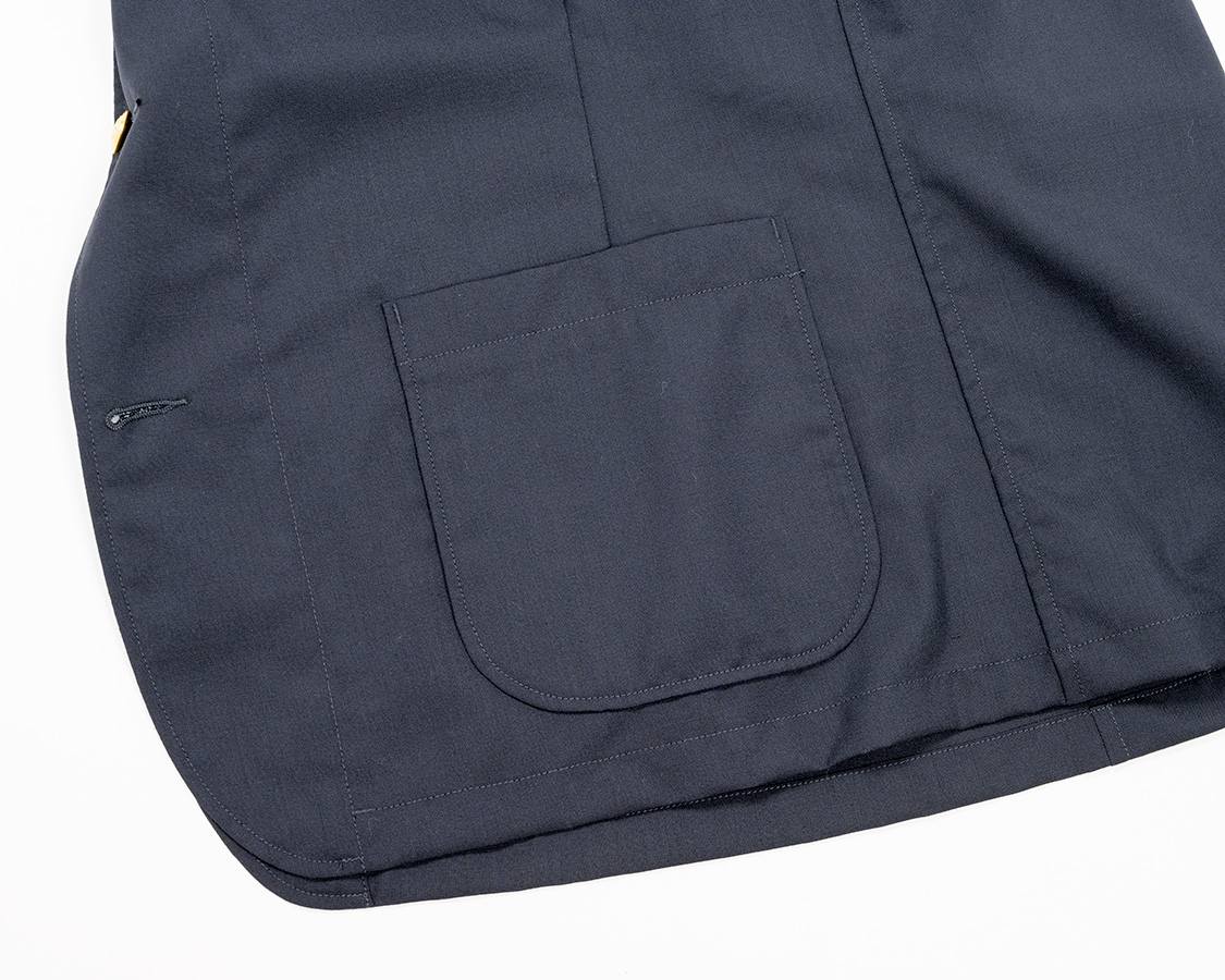 腰ポケットも胸ポケと同じ裏地付き。手を入れた時にコットンの裏地が心地よい。脇の絞り、以前は3面体を良く使いましたが今回はダーツ使って2面。そのダーツをまたぐ位置に腰ポケット。